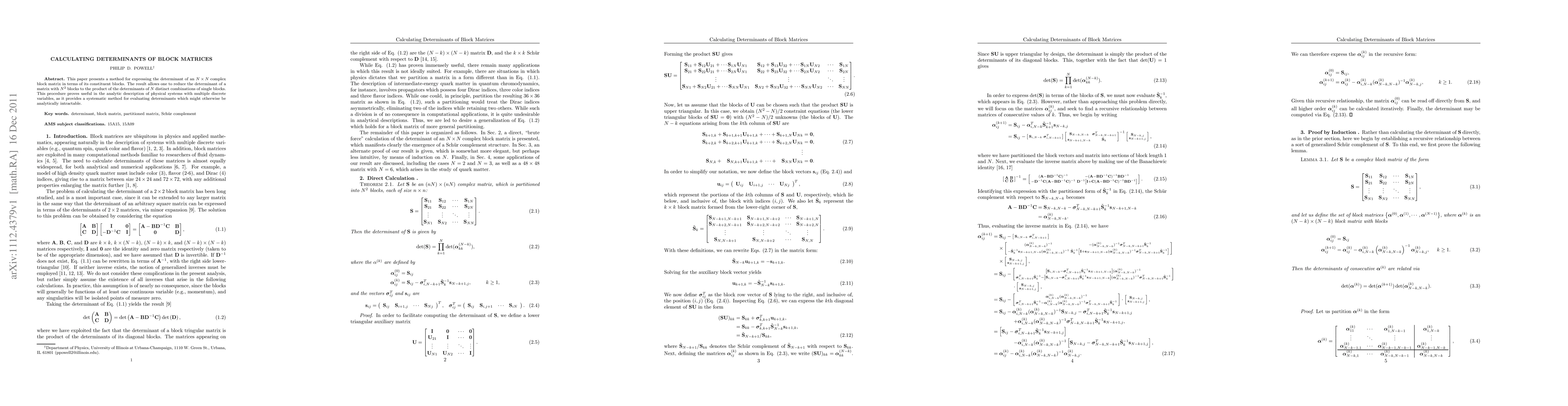 The paper presents a method to calculate the determinant of an NxN complex block matrix as the product of determinants of distinct single blocks, providing a systematic approach to evaluating analytically intractable determinants.