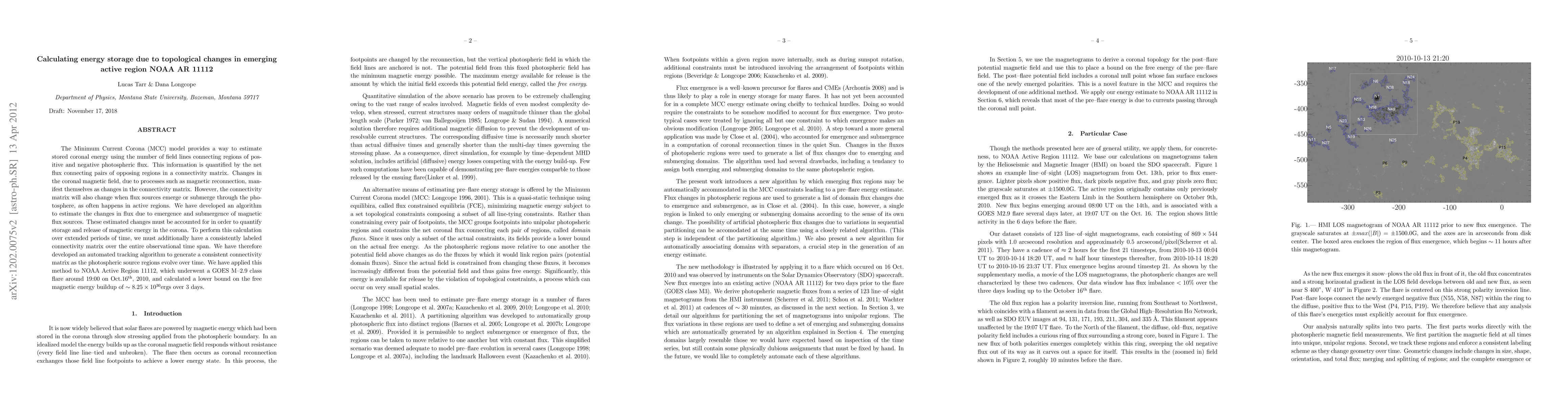 The Minimum Current Corona (MCC) model provides a way to estimate stored coronal energy using the number of field lines connecting regions of positive and negative photospheric flux. This information is quantified by the net flux connecting pairs of opposing regions in a connectivity matrix. Changes in the coronal magnetic field, due to processes such as magnetic reconnection, manifest themselves as changes in the connectivity matrix. However, the connectivity matrix will also change when flux sources emerge or submerge through the photosphere, as often happens in active regions. We have developed an algorithm to estimate the changes in flux due to emergence and submergence of magnetic flux sources. These estimated changes must be accounted for in order to quantify storage and release of magnetic energy in the corona. To perform this calculation over extended periods of time, we must additionally have a consistently labeled connectivity matrix over the entire observational time span. We have therefore developed an automated tracking algorithm to generate a consistent connectivity matrix as the photospheric source regions evolve over time. We have applied this method to NOAA Active Region 11112, which underwent a GOES M2.9 class flare around 19:00 on Oct.16th, 2010, and calculated a lower bound on the free magnetic energy buildup of ~8.25 x 10^30 ergs over 3 days.
