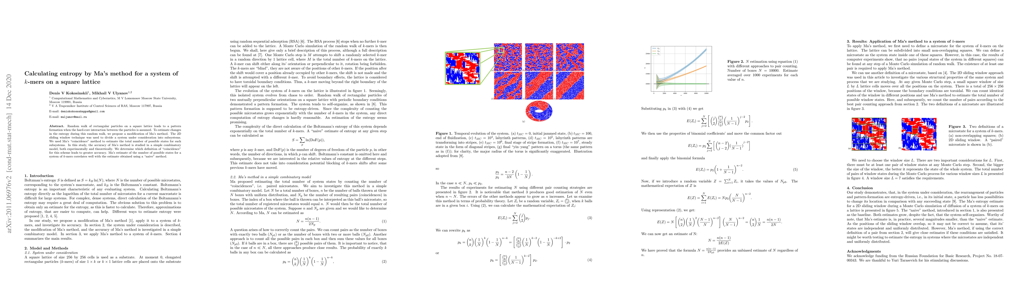 This research paper explores Ma's method for estimating Boltzmann's entropy in systems of k-mers on a square lattice, finding that Ma's 'coincidence' method correlates well with simpler estimates when complex interactions are disregarded. The study validates the method's accuracy through a combinatorial model, both theoretically and experimentally.