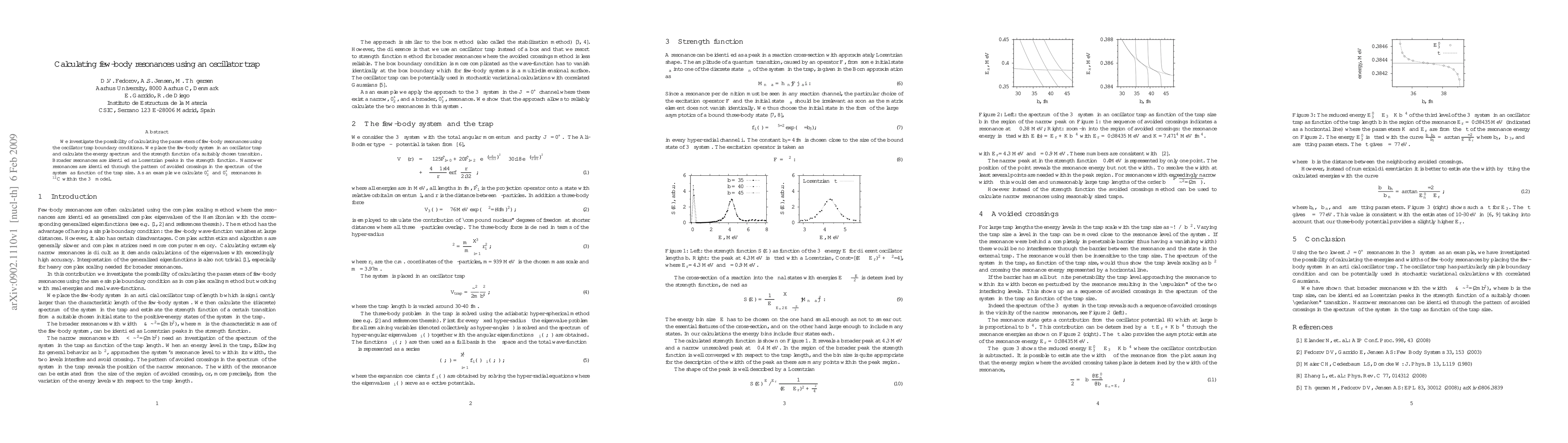 This paper explores the calculation of few-body resonance parameters using oscillator trap boundary conditions, identifying broader resonances via Lorentzian peaks in the strength function and narrower ones through avoided crossings in the energy spectrum, exemplified by 0+ resonances in 12C within the 3-alpha model.