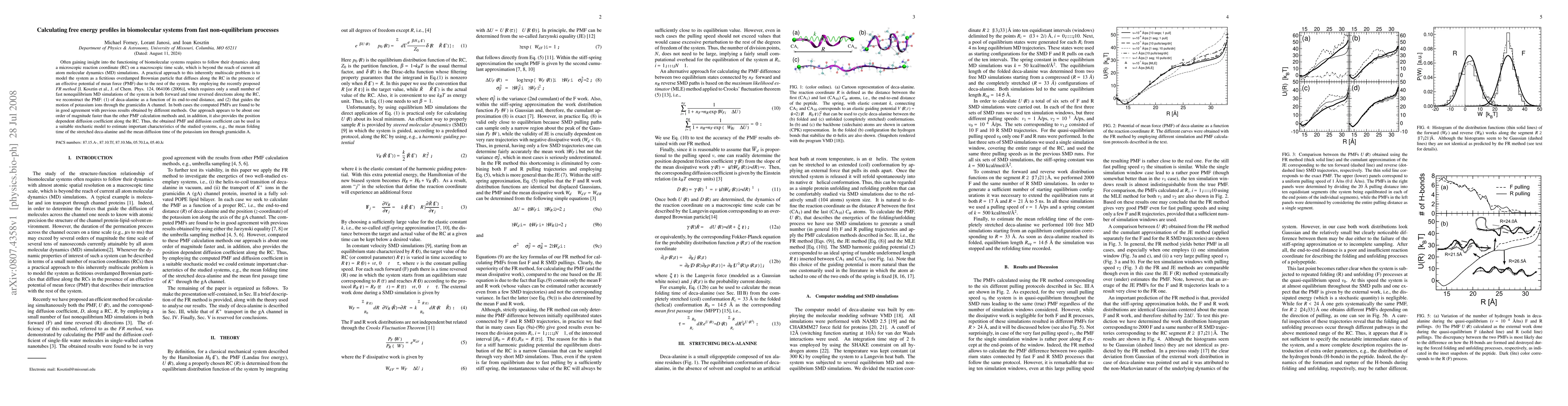 Often gaining insight into the functioning of biomolecular systems requires to follow their dynamics along a microscopic reaction coordinate (RC) on a macroscopic time scale, which is beyond the reach of current all atom molecular dynamics (MD) simulations. A practical approach to this inherently multiscale problem is to model the system as a fictitious overdamped Brownian particle that diffuses along the RC in the presence of an effective potential of mean force (PMF) due to the rest of the system. By employing the recently proposed FR method [I. Kosztin et al., J. of Chem. Phys. 124, 064106 (2006)], which requires only a small number of fast nonequilibrium MD simulations of the system in both forward and time reversed directions along the RC, we reconstruct the PMF: (1) of deca-alanine as a function of its end-to-end distance, and (2) that guides the motion of potassium ions through the gramicidin A channel. In both cases the computed PMFs are found to be in good agreement with previous results obtained by different methods. Our approach appears to be about one order of magnitude faster than the other PMF calculation methods and, in addition, it also provides the position dependent diffusion coefficient along the RC. Thus, the obtained PMF and diffusion coefficient can be used in a suitable stochastic model to estimate important characteristics of the studied systems, e.g., the mean folding time of the stretched deca-alanine and the mean diffusion time of the potassium ion through gramicidin A.