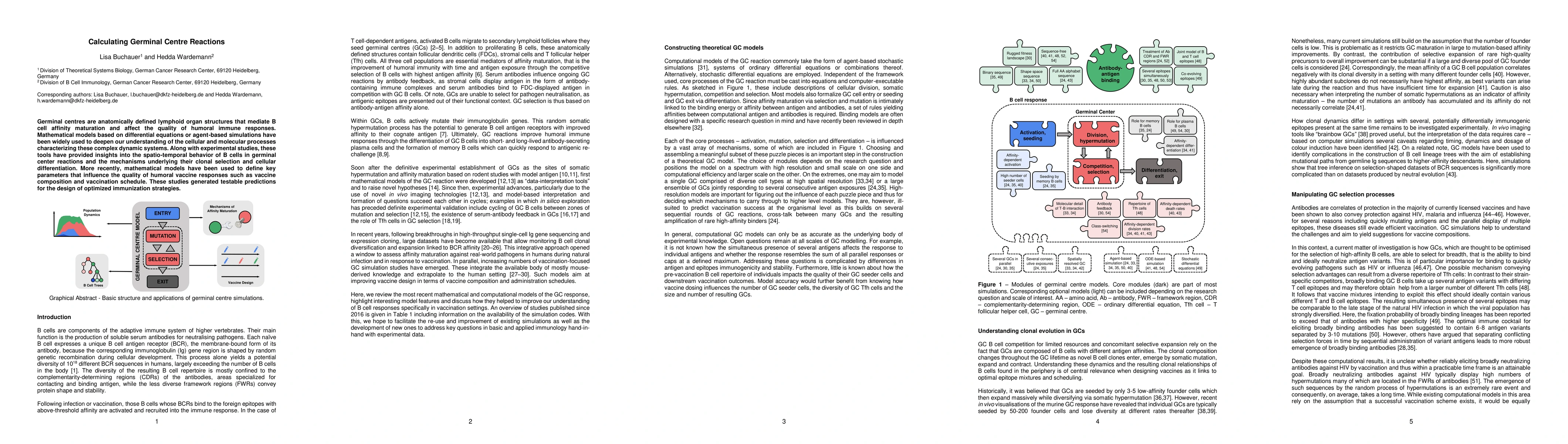 This paper reviews mathematical and computational models of germinal centre reactions, emphasizing their role in understanding B cell dynamics, clonal selection, and the impact of vaccine composition and schedules on humoral immune responses. It highlights how these models enhance our comprehension of B cell responses in immunization contexts.