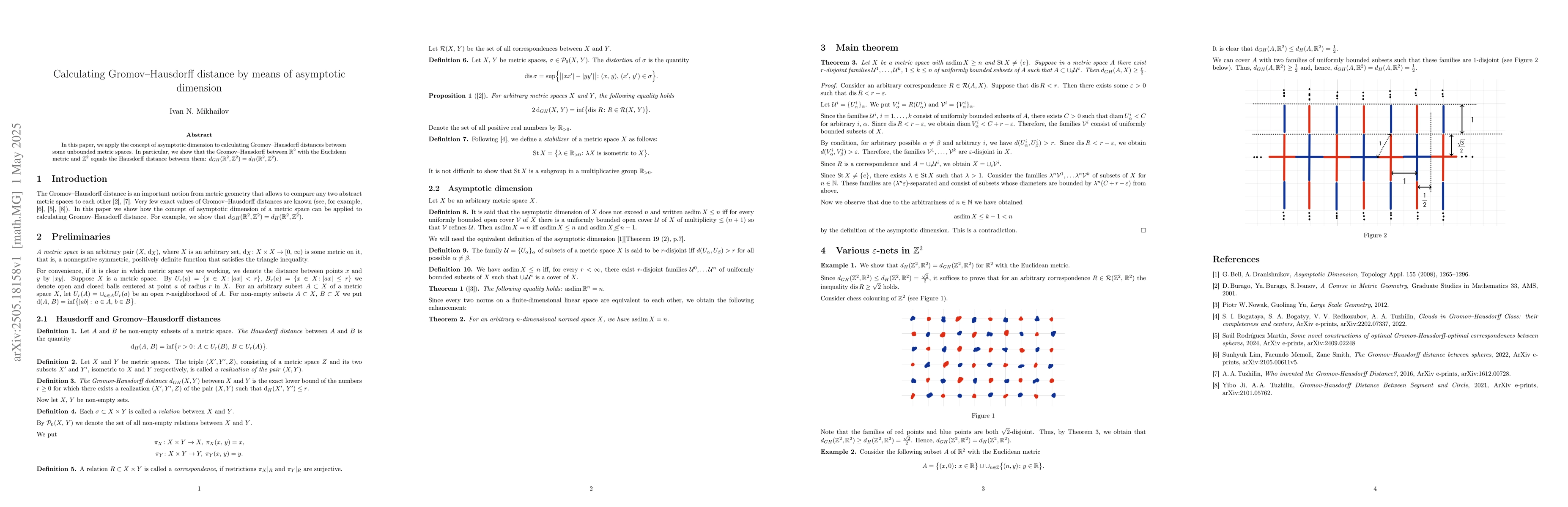 The paper applies asymptotic dimension to compute Gromov-Hausdorff distances between unbounded metric spaces.