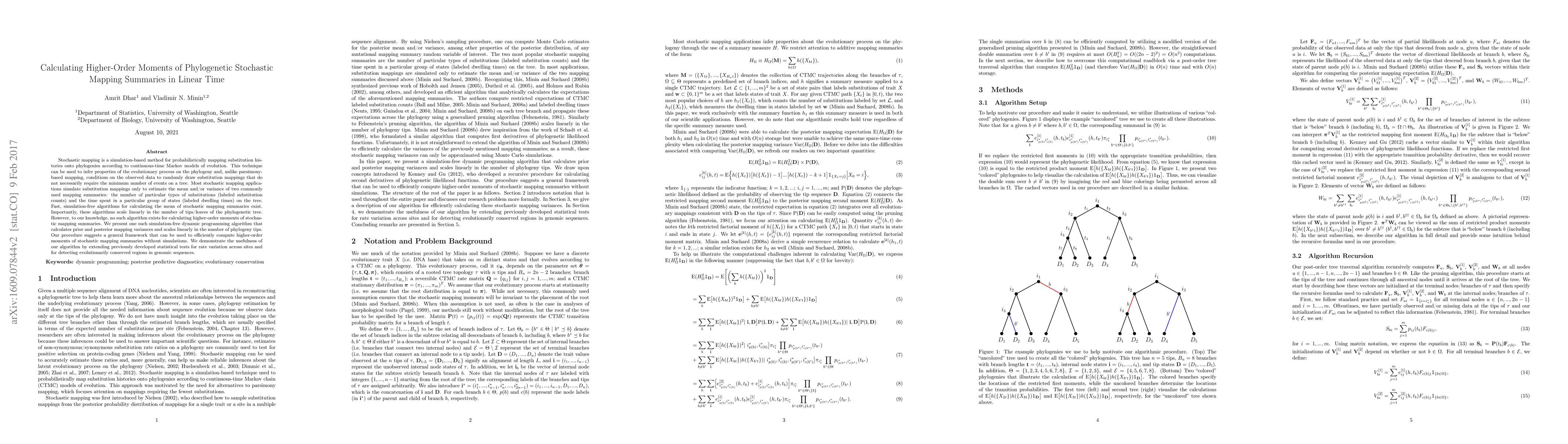 This paper presents a linear-time dynamic programming algorithm for calculating higher-order moments of phylogenetic stochastic mapping summaries without simulations, extending the framework for efficient computation of these moments and demonstrating its application in statistical tests for rate variation and conserved regions in genomic sequences.