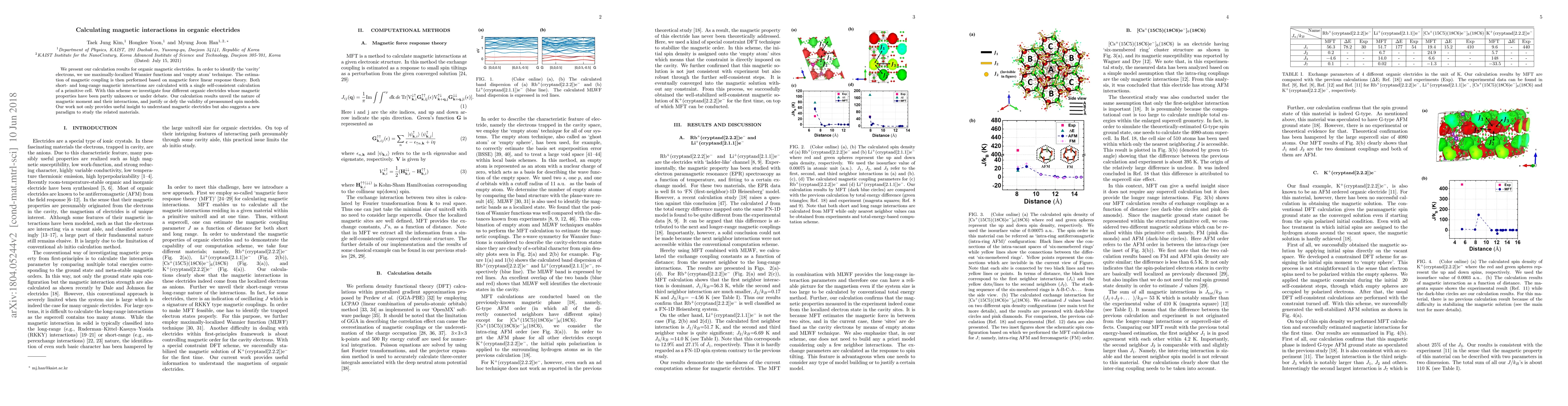 We present our calculation results for organic magnetic electrides. In order to identify the `cavity' electrons, we use maximally-localized Wannier functions and `empty atom' technique. The estimation of magnetic coupling is then performed based on magnetic force linear response theory. Both short- and long-range magnetic interactions are calculated with a single self-consistent calculation of a primitive cell. With this scheme we investigate four different organic electrides whose magnetic properties have been partly unknown or under debate. Our calculation results unveil the nature of magnetic moment and their interactions, and justify or defy the validity of preassumed spin models. Our work not only provides useful insight to understand magnetic electrides but also suggests a new paradigm to study the related materials.