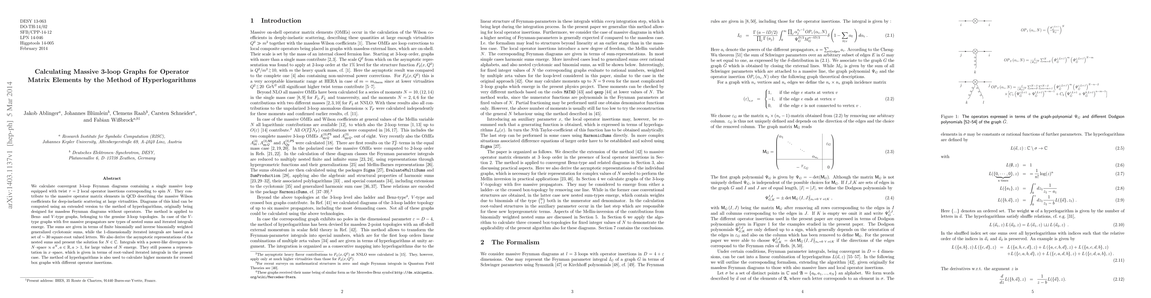This paper calculates convergent 3-loop Feynman diagrams with massive loops and operator insertions using an extended method of hyperlogarithms, originally designed for massless diagrams. It applies this method to Benz- and V-type graphs, deriving new nested sums and iterated integrals, and discusses asymptotic representations for large values of the spin N.