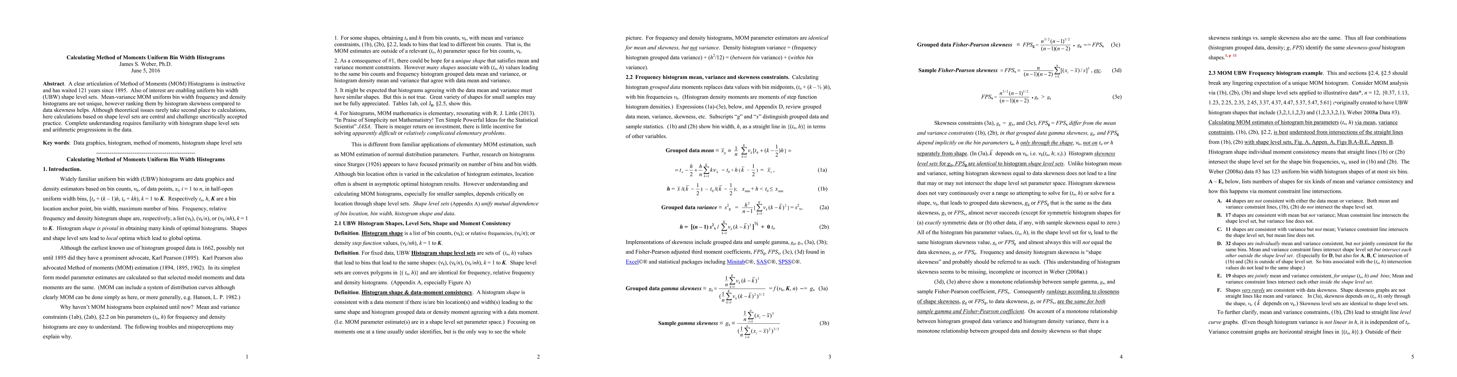 A clear articulation of Method of Moments (MOM) Histograms is instructive and has waited 121 years since 1895. Also of interest are enabling uniform bin width (UBW) shape level sets. Mean-variance MOM uniform bin width frequency and density histograms are not unique, however ranking them by histogram skewness compared to data skewness helps. Although theoretical issues rarely take second place to calculations, here calculations based on shape level sets are central and challenge uncritically accepted practice. Complete understanding requires familiarity with histogram shape level sets and arithmetic progressions in the data.