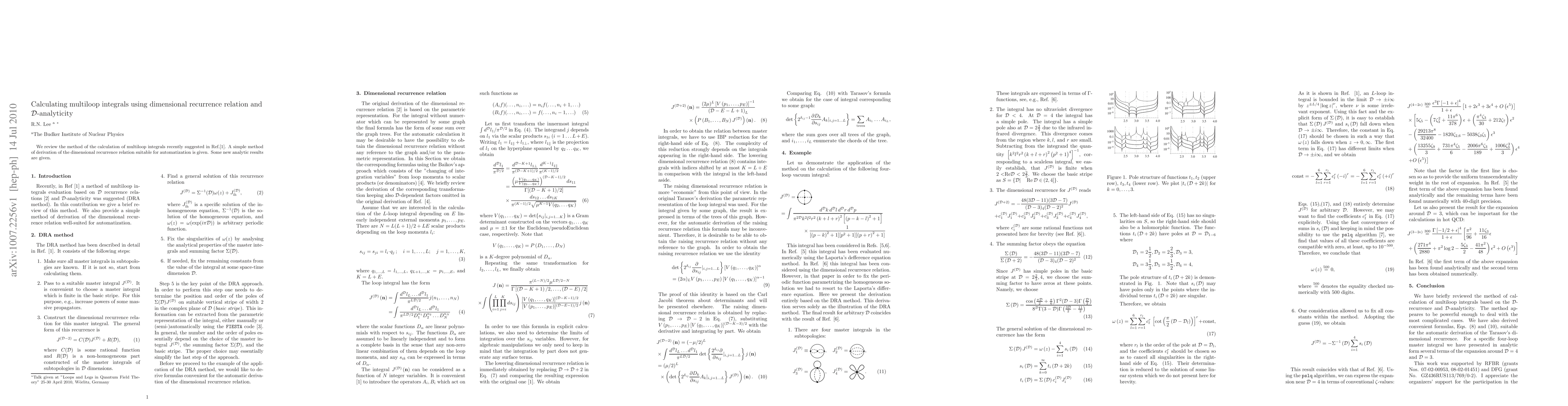This paper reviews a method for calculating multiloop integrals using dimensional recurrence relations and D-analyticity, providing a new approach to automatization and some additional analytic results.