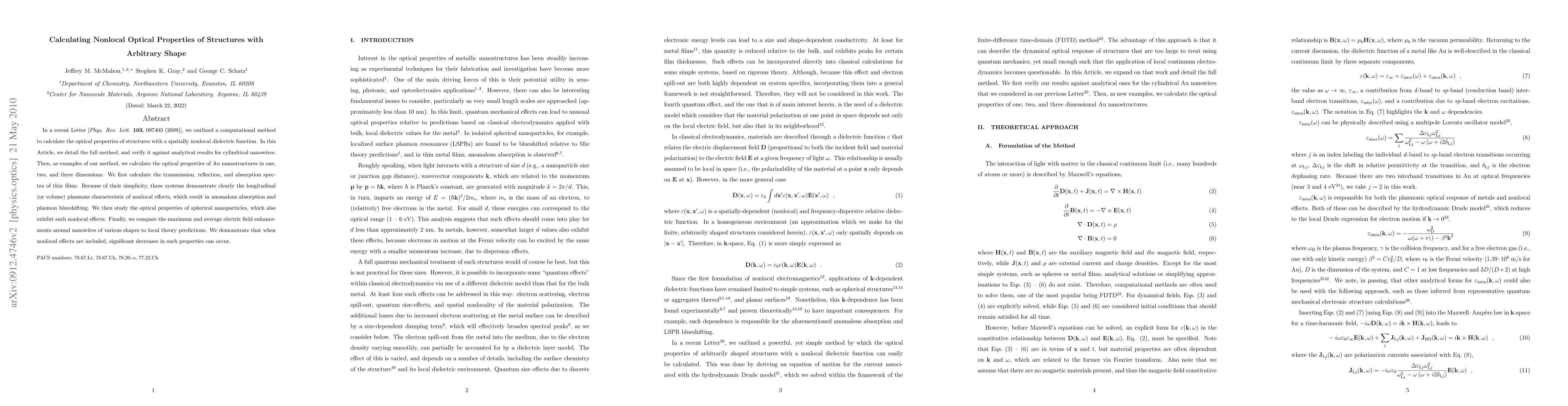 In a recent Letter [Phys. Rev. Lett. 103, 097403 (2009)], we outlined a computational method to calculate the optical properties of structures with a spatially nonlocal dielectric function. In this Article, we detail the full method, and verify it against analytical results for cylindrical nanowires. Then, as examples of our method, we calculate the optical properties of Au nanostructures in one, two, and three dimensions. We first calculate the transmission, reflection, and absorption spectra of thin films. Because of their simplicity, these systems demonstrate clearly the longitudinal (or volume) plasmons characteristic of nonlocal effects, which result in anomalous absorption and plasmon blueshifting. We then study the optical properties of spherical nanoparticles, which also exhibit such nonlocal effects. Finally, we compare the maximum and average electric field enhancements around nanowires of various shapes to local theory predictions. We demonstrate that when nonlocal effects are included, significant decreases in such properties can occur.