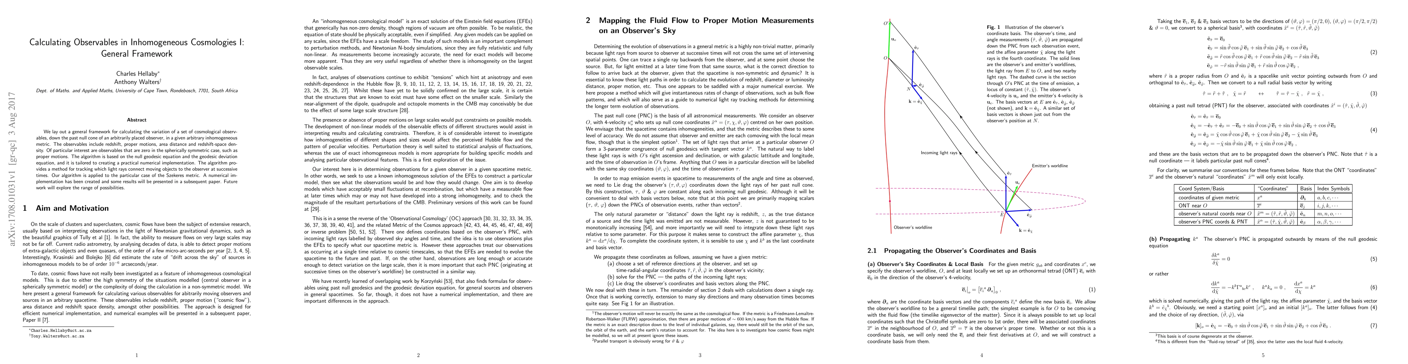 We lay out a general framework for calculating the variation of a set of cosmological observables, down the past null cone of an arbitrarily placed observer, in a given arbitrary inhomogeneous metric. The observables include redshift, proper motions, area distance and redshift-space density. Of particular interest are observables that are zero in the spherically symmetric case, such as proper motions. The algorithm is based on the null geodesic equation and the geodesic deviation equation, and it is tailored to creating a practical numerical implementation. The algorithm provides a method for tracking which light rays connect moving objects to the observer at successive times. Our algorithm is applied to the particular case of the Szekeres metric. A numerical implementation has been created and some results will be presented in a subsequent paper. Future work will explore the range of possibilities.