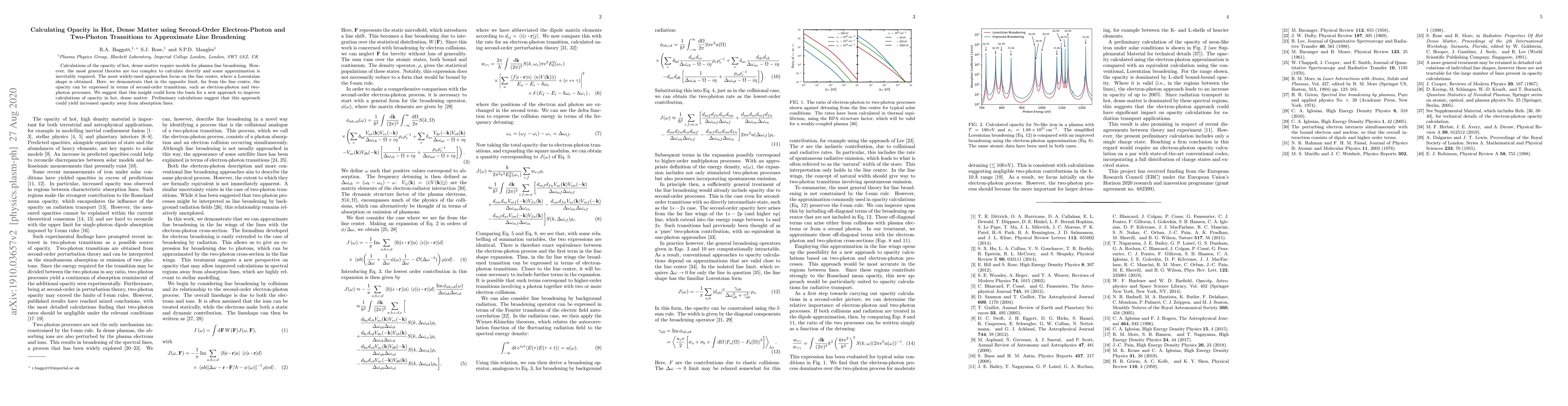 This paper proposes a new method for calculating the opacity of hot, dense matter by considering second-order electron-photon and two-photon transitions, which can approximate line broadening far from the line centre. This approach may improve opacity calculations and suggest increased opacity away from absorption lines.