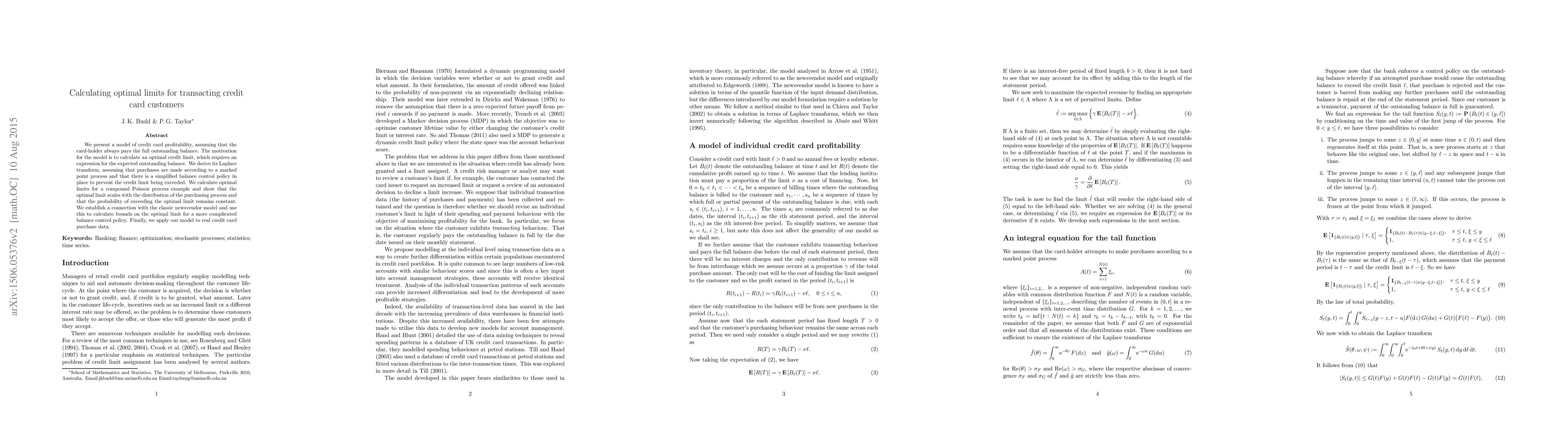 We present a model of credit card profitability, assuming that the card-holder always pays the full outstanding balance. The motivation for the model is to calculate an optimal credit limit, which requires an expression for the expected outstanding balance. We derive its Laplace transform, assuming that purchases are made according to a marked point process and that there is a simplified balance control policy in place to prevent the credit limit being exceeded. We calculate optimal limits for a compound Poisson process example and show that the optimal limit scales with the distribution of the purchasing process and that the probability of exceeding the optimal limit remains constant. We establish a connection with the classic newsvendor model and use this to calculate bounds on the optimal limit for a more complicated balance control policy. Finally, we apply our model to real credit card purchase data.