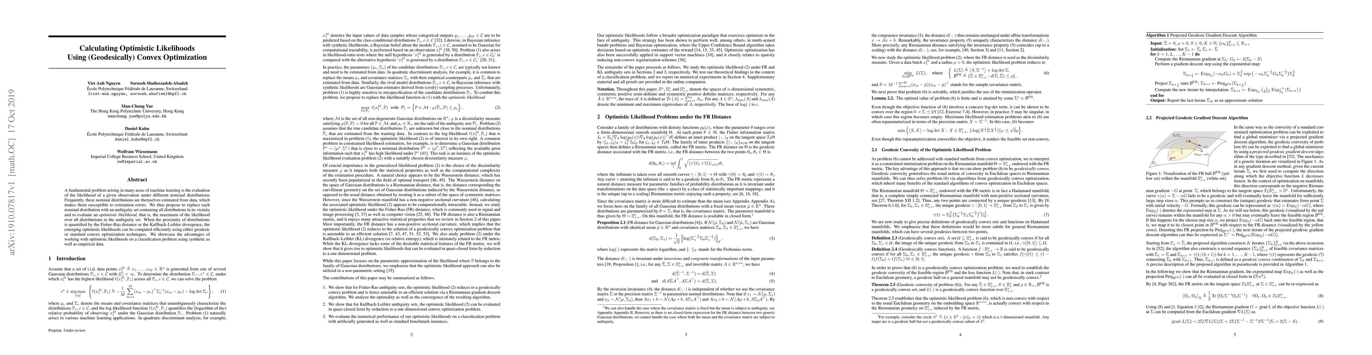 A fundamental problem arising in many areas of machine learning is the evaluation of the likelihood of a given observation under different nominal distributions. Frequently, these nominal distributions are themselves estimated from data, which makes them susceptible to estimation errors. We thus propose to replace each nominal distribution with an ambiguity set containing all distributions in its vicinity and to evaluate an \emph{optimistic likelihood}, that is, the maximum of the likelihood over all distributions in the ambiguity set. When the proximity of distributions is quantified by the Fisher-Rao distance or the Kullback-Leibler divergence, the emerging optimistic likelihoods can be computed efficiently using either geodesic or standard convex optimization techniques. We showcase the advantages of working with optimistic likelihoods on a classification problem using synthetic as well as empirical data.