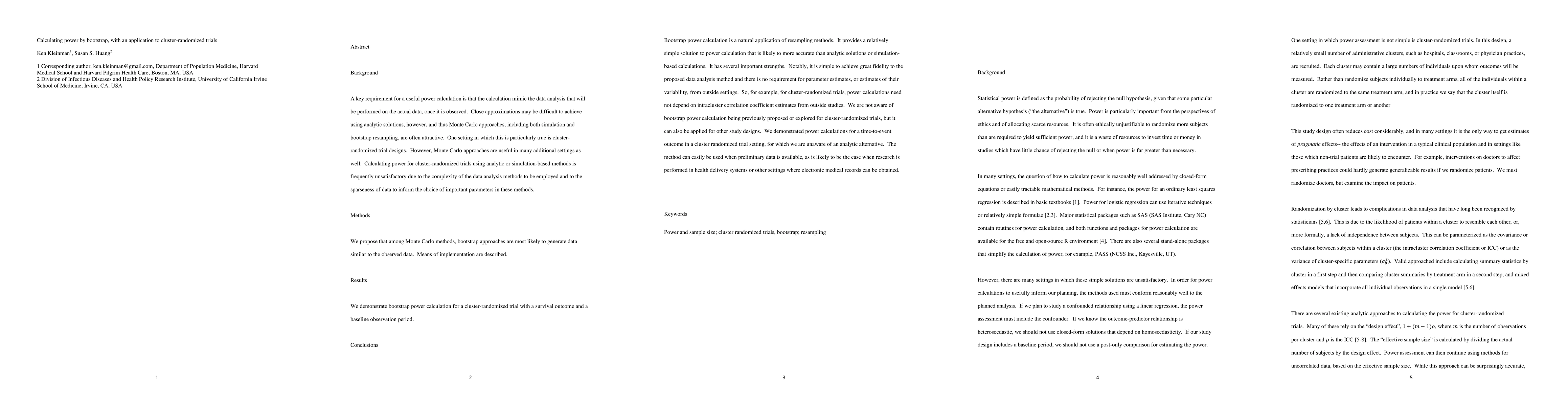 This paper proposes using bootstrap resampling methods for power calculations in cluster-randomized trials, demonstrating its application to a trial with a survival outcome. It highlights the advantages of bootstrap methods in achieving accurate power calculations without reliance on external estimates.