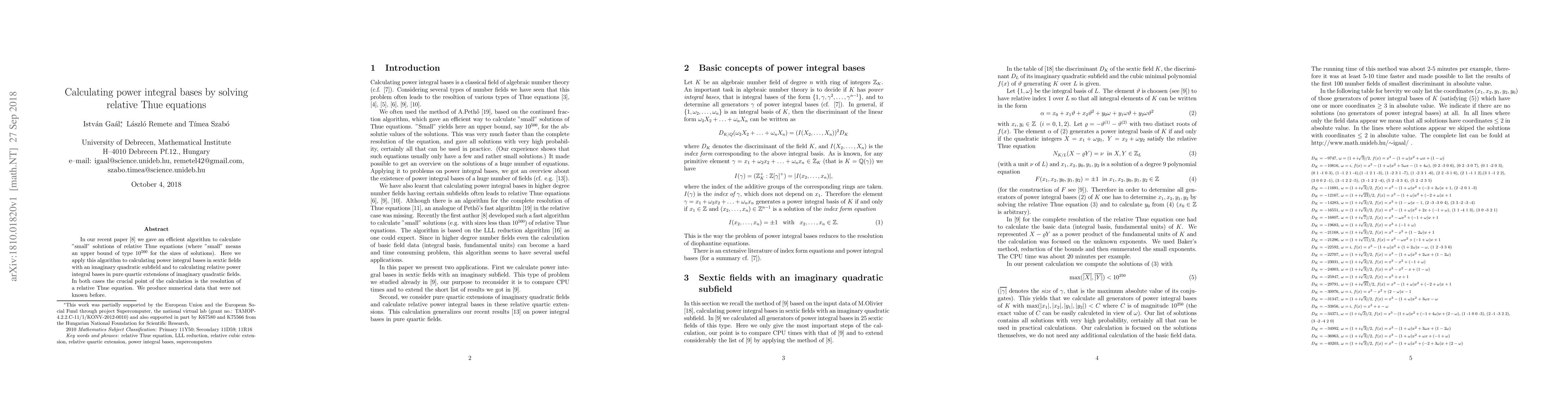 The paper presents an efficient algorithm for finding small solutions to relative Thue equations, and applies this method to identify power integral bases in sextic fields and relative power integral bases in pure quartic extensions, producing previously unknown numerical data.