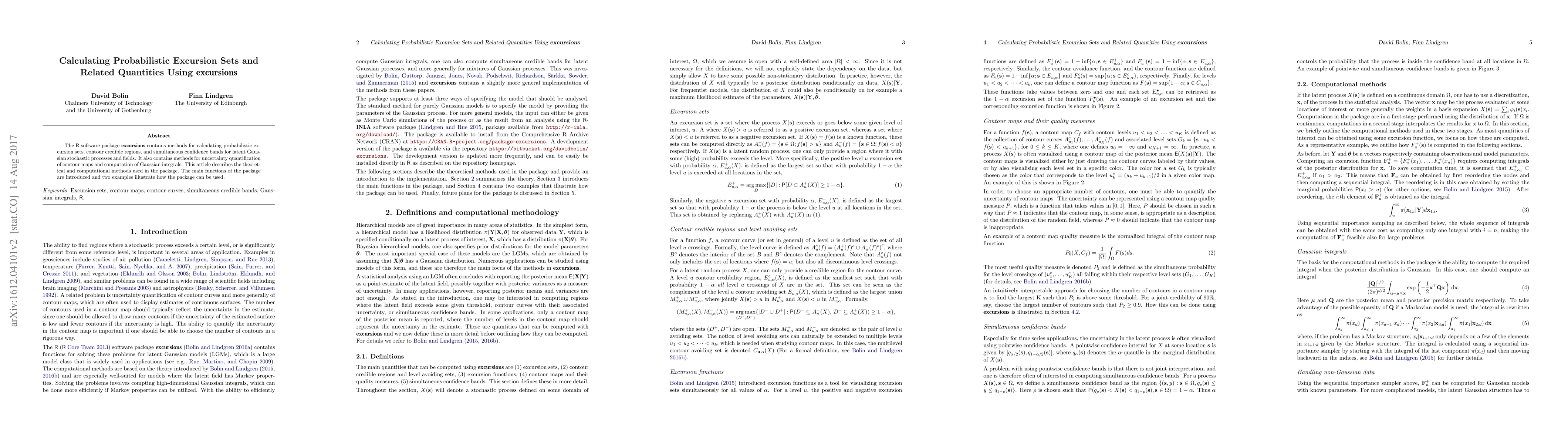 The R package "excursions" provides methods for calculating probabilistic excursion sets and related quantities for latent Gaussian stochastic processes. It includes functions for uncertainty quantification and computation of Gaussian integrals, with examples demonstrating its practical application.