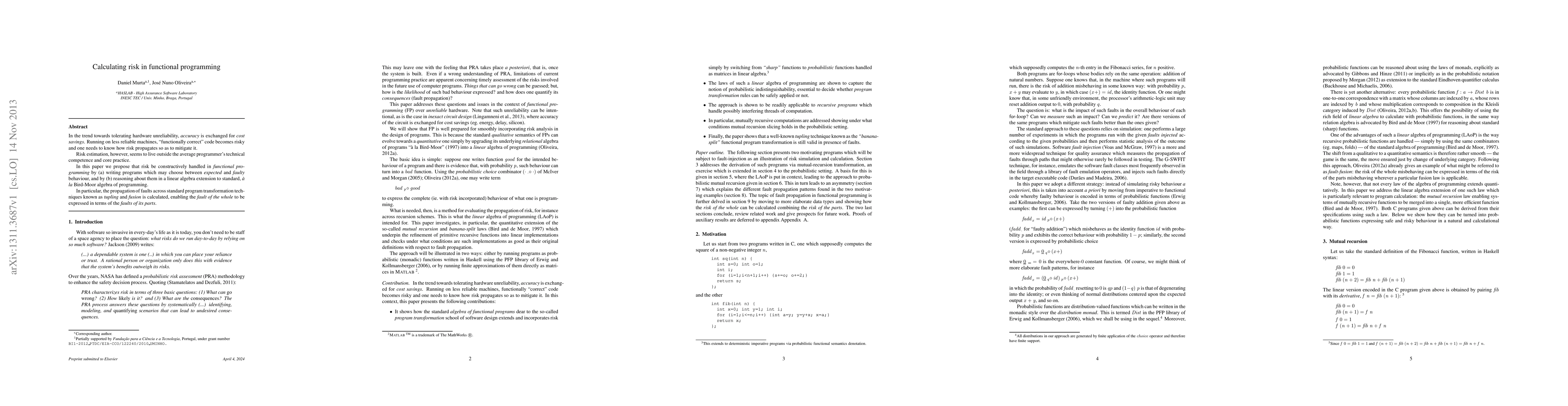 In the trend towards tolerating hardware unreliability, accuracy is exchanged for cost savings. Running on less reliable machines, "functionally correct" code becomes risky and one needs to know how risk propagates so as to mitigate it. Risk estimation, however, seems to live outside the average programmer's technical competence and core practice. In this paper we propose that risk be constructively handled in functional programming by (a) writing programs which may choose between expected and faulty behaviour, and by (b) reasoning about them in a linear algebra extension to standard, a la Bird-Moor algebra of programming. In particular, the propagation of faults across standard program transformation techniques known as tupling and fusion is calculated, enabling the fault of the whole to be expressed in terms of the faults of its parts.