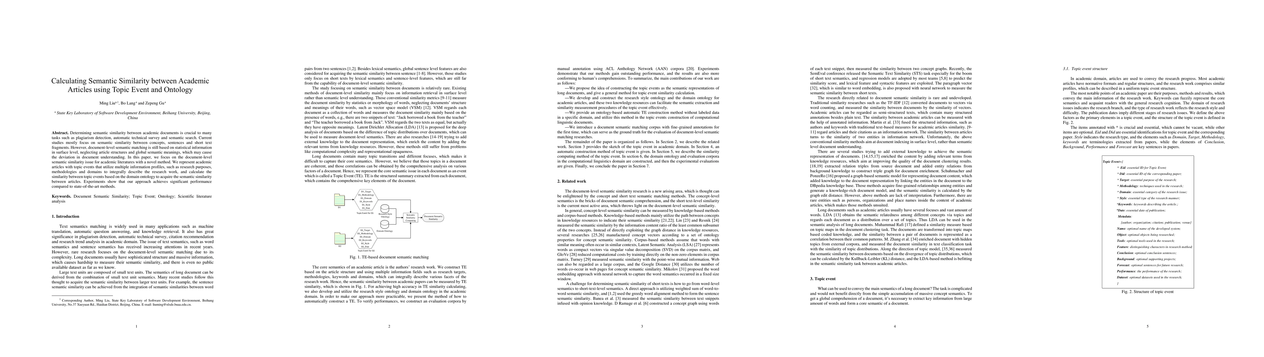 This paper proposes a novel method for calculating document-level semantic similarity between academic articles using topic events and domain ontology. The method integrates research purposes, methodologies, and domains to describe articles, achieving better performance than existing statistical approaches.
