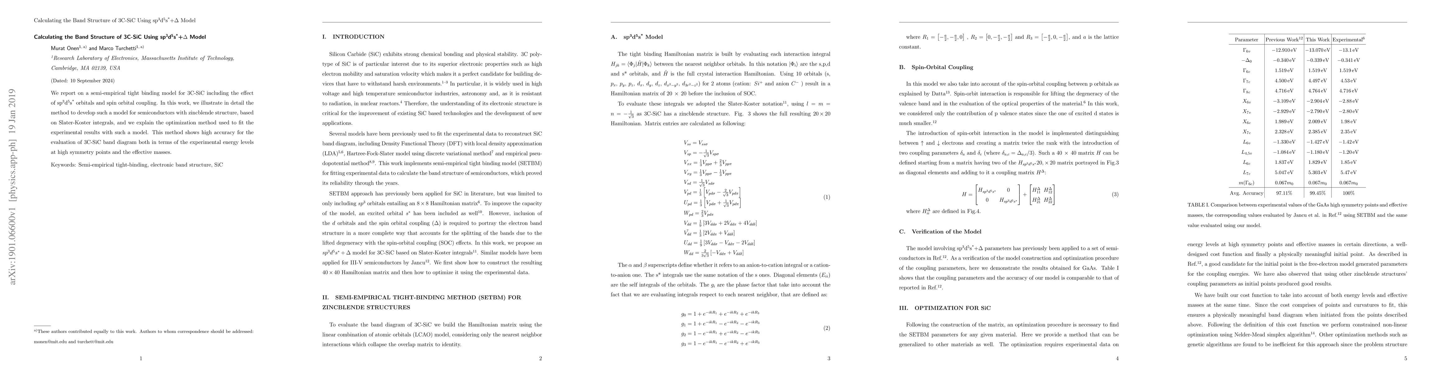 We report on a semi-empirical tight binding model for 3C-SiC including the effect of sp3d5s* orbitals and spin-orbital coupling. In this work, we illustrate in detail the method to develop such a model for semiconductors with zincblende structure, based on Slater-Koster integrals, and we explain the optimization method used to fit the experimental results with such a model. This method shows high accuracy for the evaluation of 3C-SiC band diagram both in terms of the experimental energy levels at high symmetry points and the effective masses.