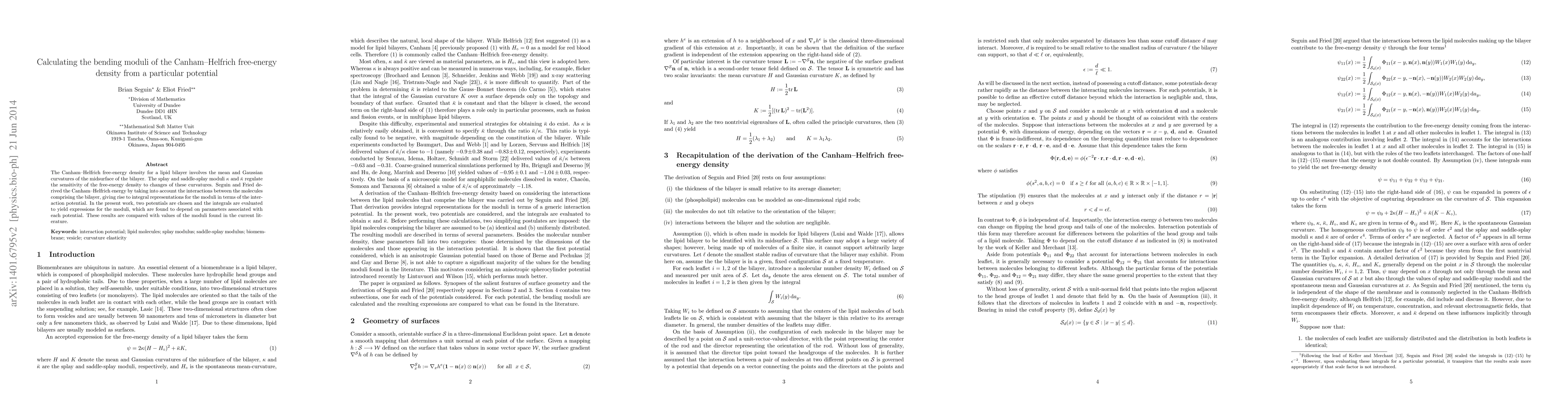 This paper calculates the bending moduli $\kappa$ and $\bar\kappa$ for the Canham-Helfrich free-energy density of lipid bilayers using two specific interaction potentials, deriving expressions that depend on potential parameters and comparing them to existing literature values.