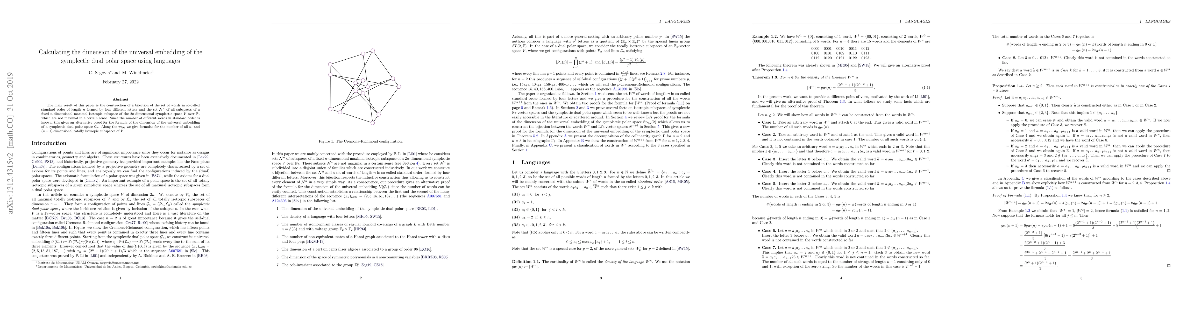 The main result of this paper is the construction of a bijection of the set of words in so-called standard order of length $n$ formed by four different letters and the set $\mathbb{N}^n$ of all subspaces of a fixed $n$-dimensional maximal isotropic subspace of the $2n$-dimensional symplectic space $V$ over $\mathbb{F}_2$ which are not maximal in a certain sense. Since the number of different words in standard order is known, this gives an alternative proof for the formula of the dimension of the universal embedding of a symplectic dual polar space $\mathcal G_n$. Along the way, we give formulas for the number of all $n$- and $(n-1)$-dimensional totally isotropic subspaces of $V$.