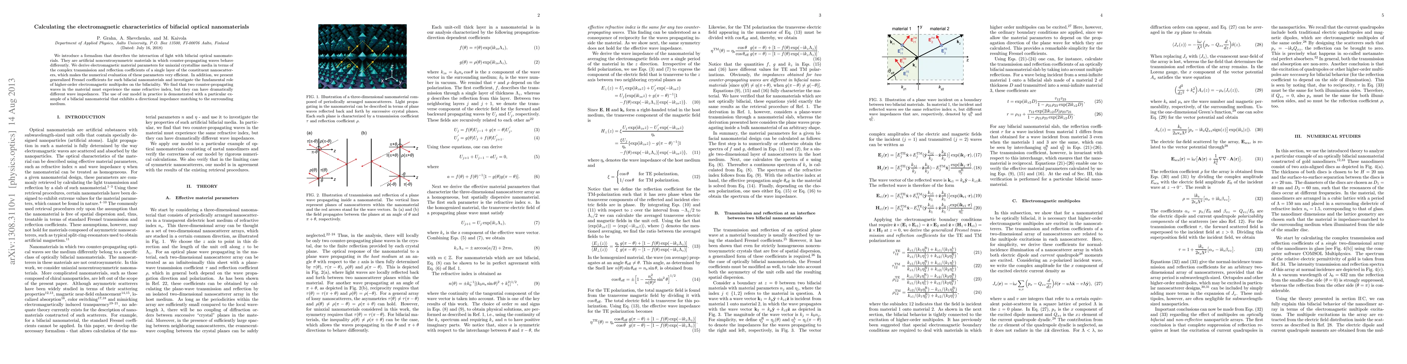 We introduce a formalism that describes the interaction of light with bifacial optical nanomaterials. They are artificial noncentrosymmetric materials in which counter-propagating waves behave differently. We derive electromagnetic material parameters for uniaxial crystalline media in terms of the complex transmission and reflection coefficients of a single layer of the constituent nanoscatterers, which makes the numerical evaluation of these parameters very efficient. In addition, we present generalized Fresnel coefficients for such bifacial nanomaterials and investigate the fundamental role of higher-order electromagnetic multipoles on the bifaciality. We find that two counter-propagating waves in the material must experience the same refractive index, but they can have dramatically different wave impedances. The use of our model in practice is demonstrated with a particular example of a bifacial nanomaterial that exhibits a directional impedance matching to the surrounding medium.