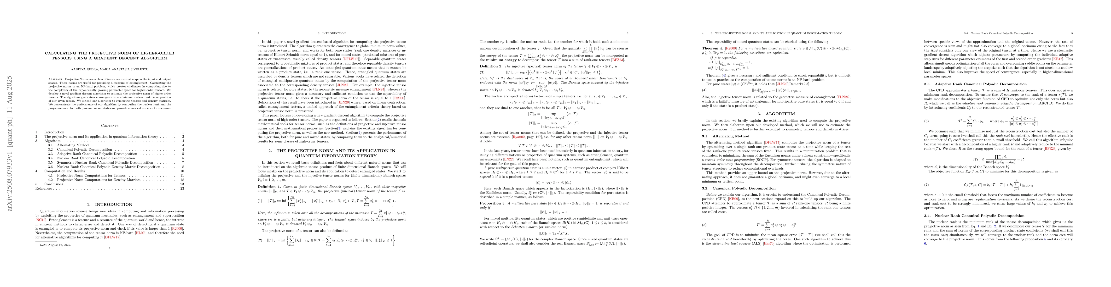 Projective Norms are a class of tensor norms that map on the input and output spaces. These norms are useful for providing a measure of entanglement. Calculating the projective norms is an NP-hard problem, which creates challenges in computing due to the complexity of the exponentially growing parameter space for higher-order tensors. We develop a novel gradient descent algorithm to estimate the projective norm of higher-order tensors. The algorithm guarantees convergence to a minimum nuclear rank decomposition of our given tensor. We extend our algorithm to symmetric tensors and density matrices. We demonstrate the performance of our algorithm by computing the nuclear rank and the projective norm for both pure and mixed states and provide numerical evidence for the same.