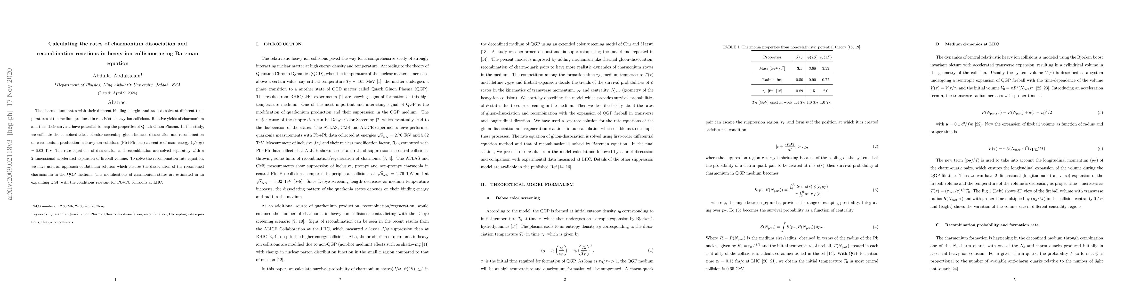 This paper investigates the rates of charmonium dissociation and recombination in relativistic heavy-ion collisions using the Bateman equation. It estimates the combined effects of color screening, gluon-induced processes, and recombination on charmonium production in Pb+Pb collisions at 5.02 TeV, analyzing the properties of the Quark Gluon Plasma.