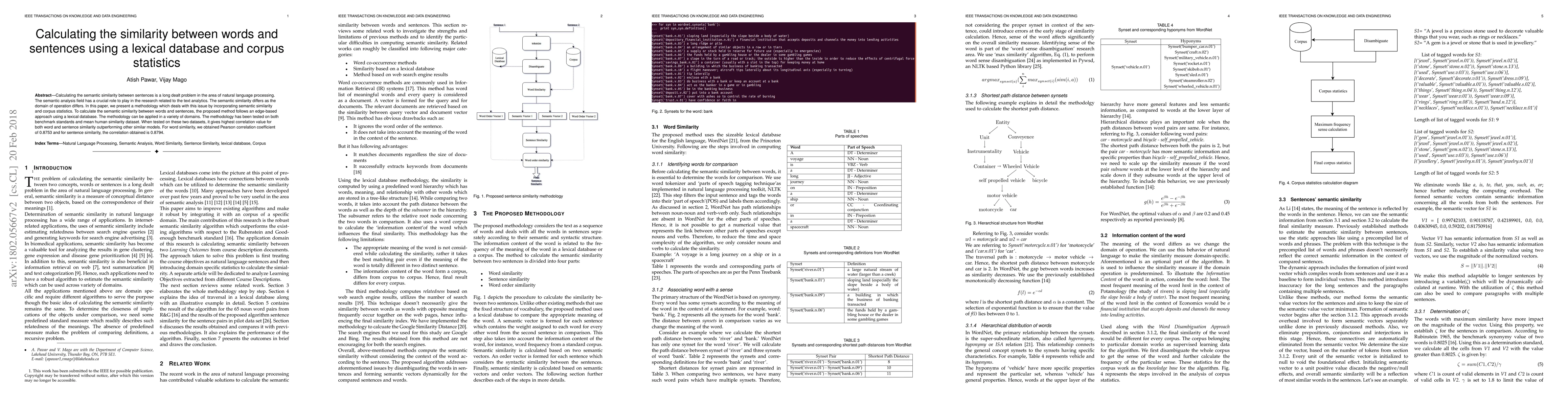 This paper proposes a methodology for calculating semantic similarity between words and sentences using a lexical database and corpus statistics. The edge-based approach achieved high correlation values of 0.8753 for word similarity and 0.8794 for sentence similarity, outperforming other models on benchmark datasets.