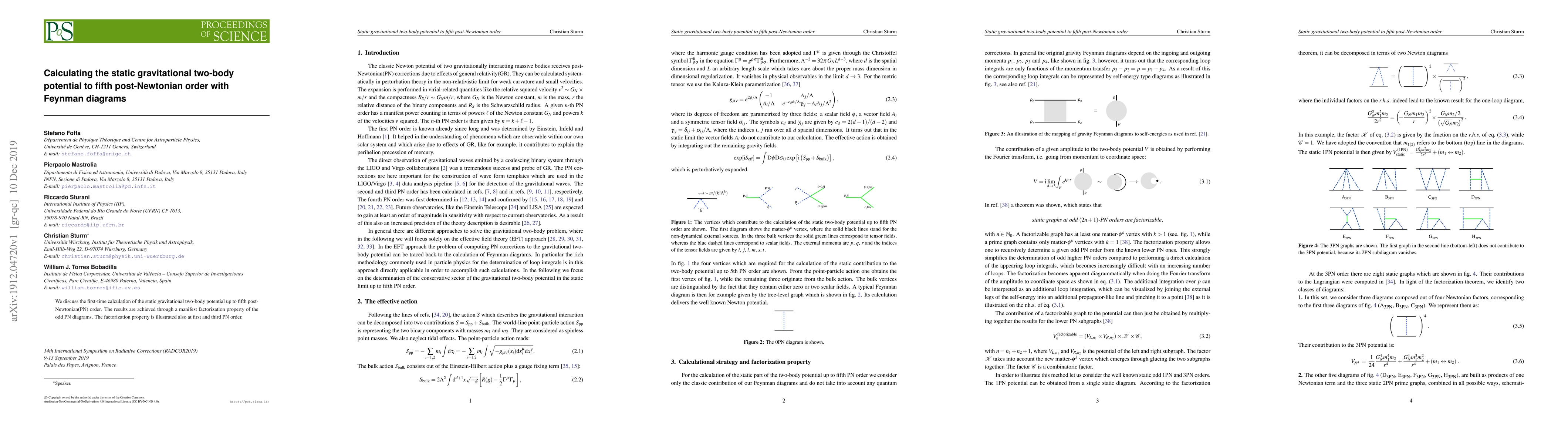 We discuss the first-time calculation of the static gravitational two-body potential up to fifth post-Newtonian(PN) order. The results are achieved through a manifest factorization property of the odd PN diagrams. The factorization property is illustrated also at first and third PN order.