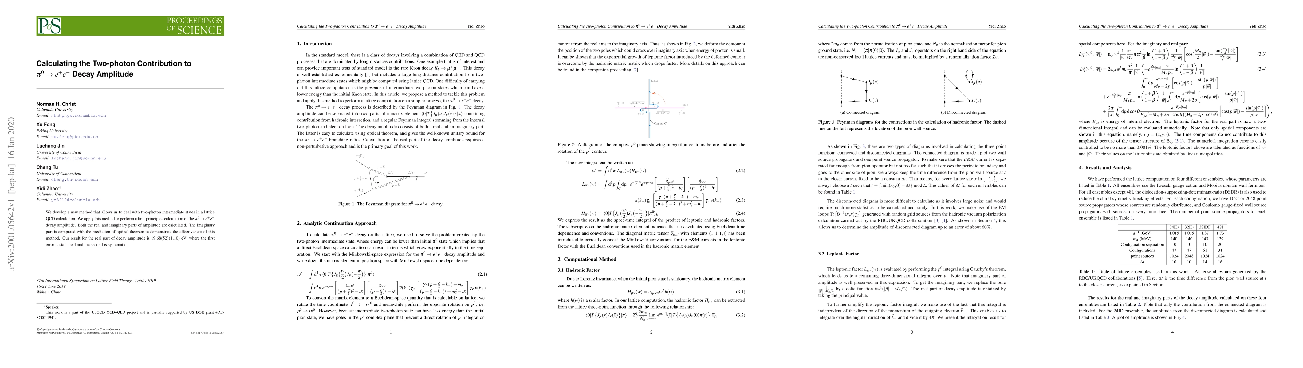 We develop a new method that allows us to deal with two-photon intermediate states in a lattice QCD calculation. We apply this method to perform a first-principles calculation of the $\pi^0 \rightarrow e^+ e^-$ decay amplitude. Both the real and imaginary parts of amplitude are calculated. The imaginary part is compared with the prediction of optical theorem to demonstrate the effectiveness of this method. Our result for the real part of decay amplitude is $19.68(52)(1.10) \ \text{eV}$, where the first error is statistical and the second is systematic.