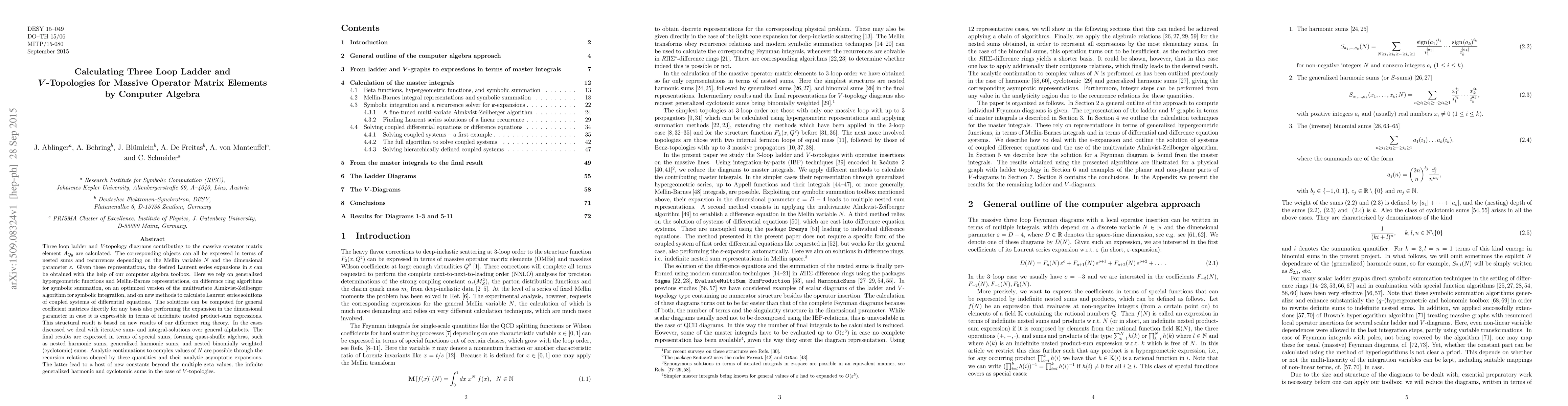 Three loop ladder and $V$-topology diagrams contributing to the massive operator matrix element $A_{Qg}$ are calculated. The corresponding objects can all be expressed in terms of nested sums and recurrences depending on the Mellin variable $N$ and the dimensional parameter $\varepsilon$. Given these representations, the desired Laurent series expansions in $\varepsilon$ can be obtained with the help of our computer algebra toolbox. Here we rely on generalized hypergeometric functions and Mellin-Barnes representations, on difference ring algorithms for symbolic summation, on an optimized version of the multivariate Almkvist-Zeilberger algorithm for symbolic integration, and on new methods to calculate Laurent series solutions of coupled systems of differential equations. The solutions can be computed for general coefficient matrices directly for any basis also performing the expansion in the dimensional parameter in case it is expressible in terms of indefinite nested product-sum expressions. This structural result is based on new results of our difference ring theory. In the cases discussed we deal with iterative sum- and integral-solutions over general alphabets. The final results are expressed in terms of special sums, forming quasi-shuffle algebras, such as nested harmonic sums, generalized harmonic sums, and nested binomially weighted (cyclotomic) sums. Analytic continuations to complex values of $N$ are possible through the recursion relations obeyed by these quantities and their analytic asymptotic expansions. The latter lead to a host of new constants beyond the multiple zeta values, the infinite generalized harmonic and cyclotomic sums in the case of $V$-topologies.
