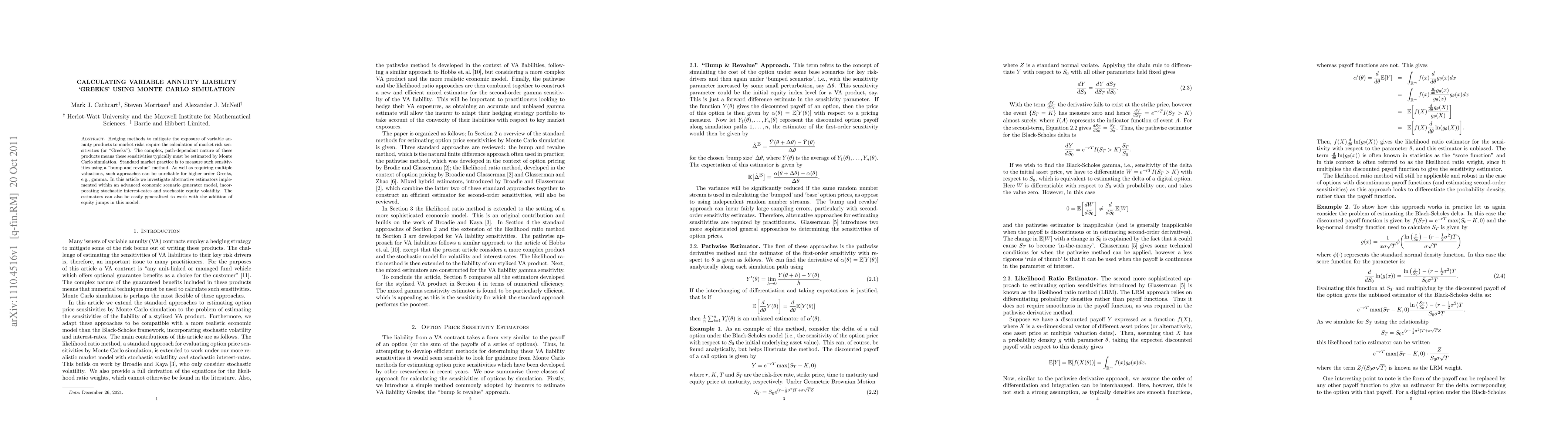 This paper explores advanced Monte Carlo simulation methods for estimating the "Greeks" of variable annuity products, which are complex and path-dependent. It proposes alternative estimators to the standard "bump and revalue" method, aiming to improve reliability, especially for higher-order Greeks like gamma, within an economic scenario generator model that includes stochastic interest rates and equity volatility.