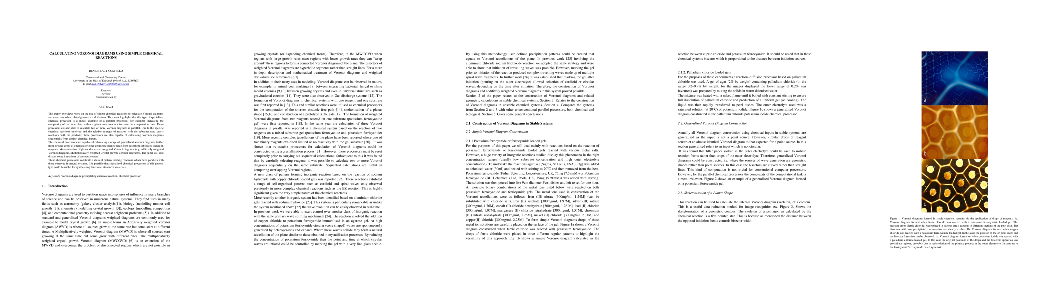 This paper overviews work on the use of simple chemical reactions to calculate Voronoi diagrams and undertake other related geometric calculations. This work highlights that this type of specialised chemical processor is a model example of a parallel processor. For example increasing the complexity of the input data within a given area does not increase the computation time. These processors are also able to calculate two or more Voronoi diagrams in parallel. Due to the specific chemical reactions involved and the relative strength of reaction with the substrate (and cross-reactivity with the products) these processors are also capable of calculating Voronoi diagrams sequentially from distinct chemical inputs. The chemical processors are capable of calculating a range of generalised Voronoi diagrams (either from circular drops of chemical or other geometric shapes made from adsorbent substrates soaked in reagent), skeletonisation of planar shapes and weighted Voronoi diagrams (e.g. additively weighted Voronoi diagrams, Multiplicitavely weighted Crystal growth Voronoi diagrams). The paper will also discuss some limitations of these processors. These chemical processors constitute a class of pattern forming reactions which have parallels with those observed in natural systems. It is possible that specialised chemical processors of this general type could be useful for synthesising functional structured materials.