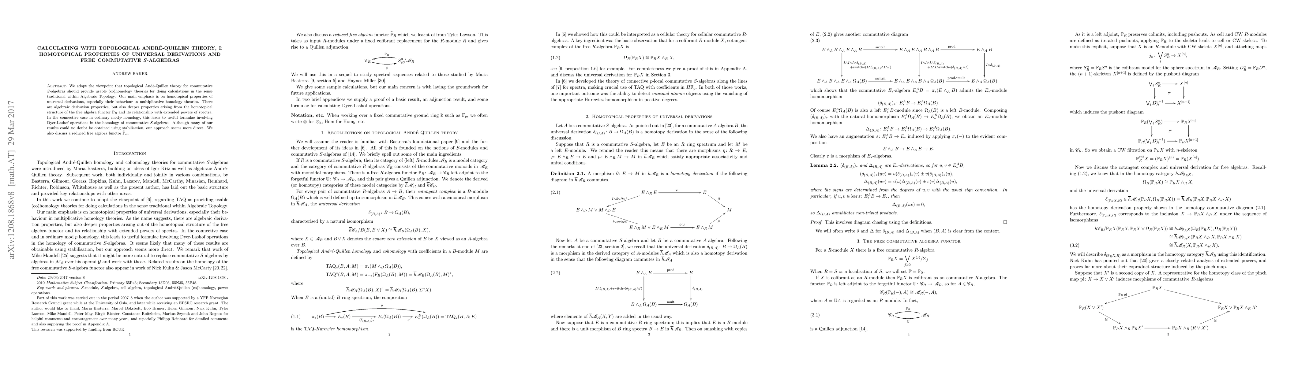 This paper explores how to calculate with topological Ande-Quillen theory for commutative S-algebras, aiming to provide usable cohomology theories for traditional Algebraic Topology calculations. It focuses on homotopical properties of universal derivations and their behavior in multiplicative homology theories.