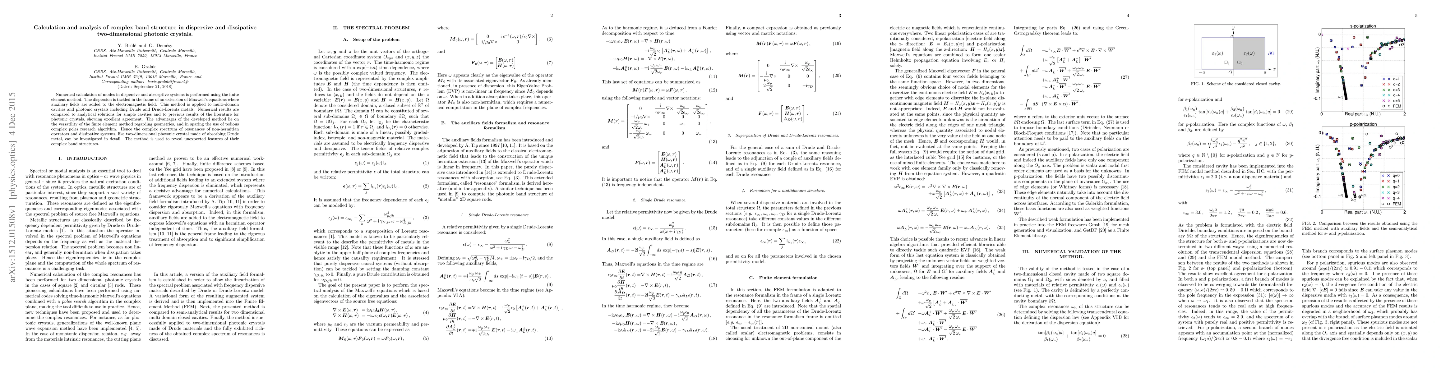 Numerical calculation of modes in dispersive and absorptive systems is performed using the finite element method. The dispersion is tackled in the frame of an extension of Maxwell's equations where auxiliary fields are added to the electromagnetic field. This method is applied to multi-domain cavities and photonic crystals including Drude and Drude-Lorentz metals. Numerical results are compared to analytical solutions for simple cavities and to previous results of the literature for photonic crystals, showing excellent agreement. The advantages of the developed method lie on the versatility of the finite element method regarding geometries, and in sparing the use of tedious complex poles research algorithm. Hence the complex spectrum of resonances of non-hermitian operators and dissipative systems, like two-dimensional photonic crystal made of absorbing Drude metal, can be investigated in detail. The method is used to reveal unexpected features of their complex band structures.