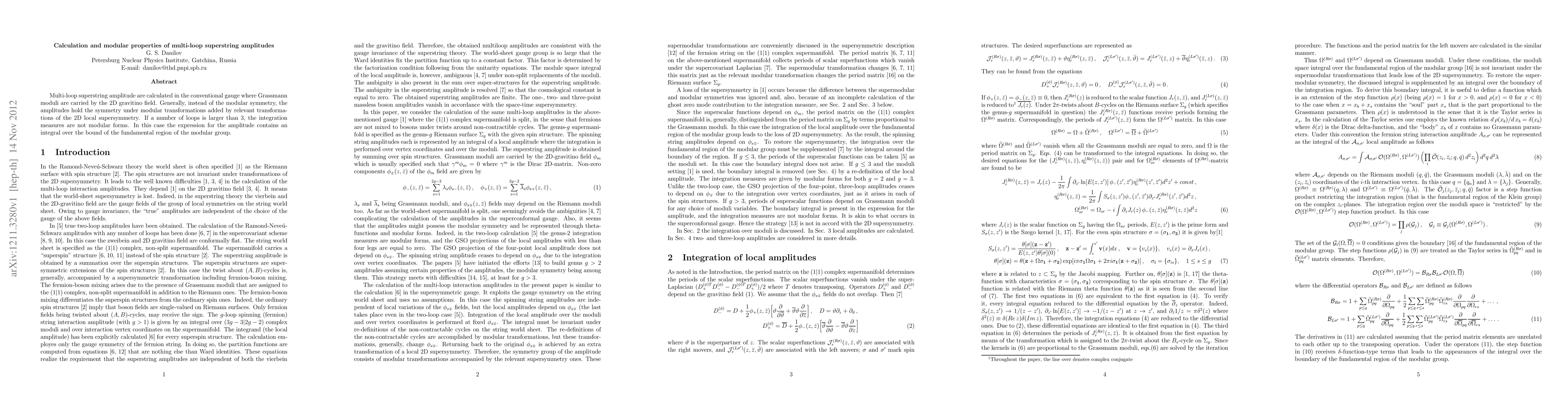 This paper calculates multi-loop superstring amplitudes in a gauge where Grassmann moduli are carried by the 2D gravitino field, revealing a symmetry under modular transformations enhanced by 2D local supersymmetry. For loops greater than three, the integration measures are not modular forms, necessitating an integral over the modular group's fundamental region.