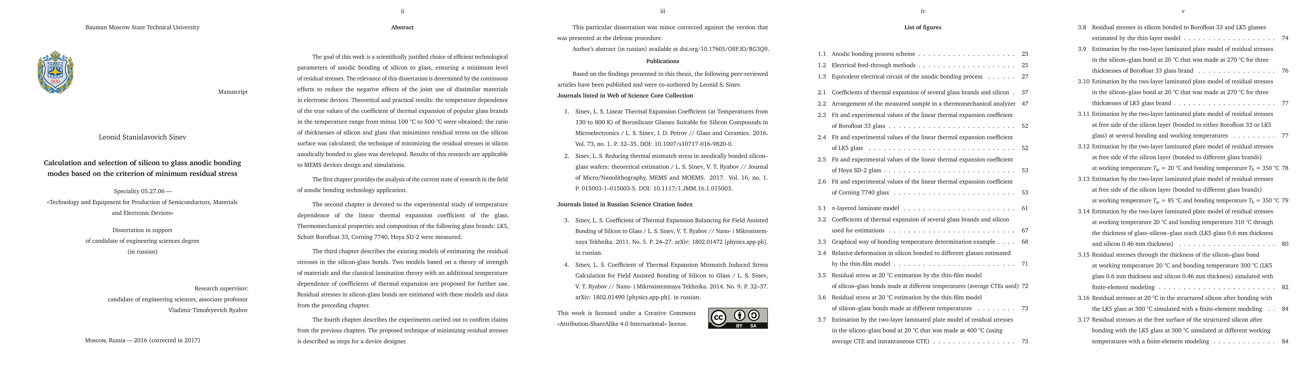 The goal of this work is a scientifically justified choice of efficient technological parameters of anodic bonding of silicon to glass, ensuring a minimum level of residual stresses. The relevance of this dissertation is determined by the continuous efforts to reduce the negative effects of the joint use of dissimilar materials in electronic devices. Theoretical and practical results: the temperature dependence of the true values of the coefficient of thermal expansion of popular glass brands in the temperature range from minus 100 \deg C to 500 \deg C were obtained; the ratio of thicknesses of silicon and glass that minimizes residual stress on the silicon surface was calculated; the technique of minimizing the residual stresses in silicon anodically bonded to glass was developed. Results of this research are applicable to MEMS devices design and simulations. The first chapter provides the analysis of the current state of research in the field of anodic bonding technology application. The second chapter is devoted to the experimental study of temperature dependence of the linear thermal expansion coefficient of the glass. Thermomechanical properties and composition of the following glass brands: LK5, Schott Borofloat 33, Corning 7740, Hoya SD-2 were measured. The third chapter describes the existing models of estimating the residual stresses in the silicon-glass bonds. Two models based on a theory of strength of materials and the classical lamination theory with an additional temperature dependence of coefficients of thermal expansion are proposed for further use. Residual stresses in silicon-glass bonds are estimated with these models and data from the preceding chapter. The fourth chapter describes the experiments carried out to confirm claims from the previous chapters. The proposed technique of minimizing residual stresses is described as steps for a device designer.