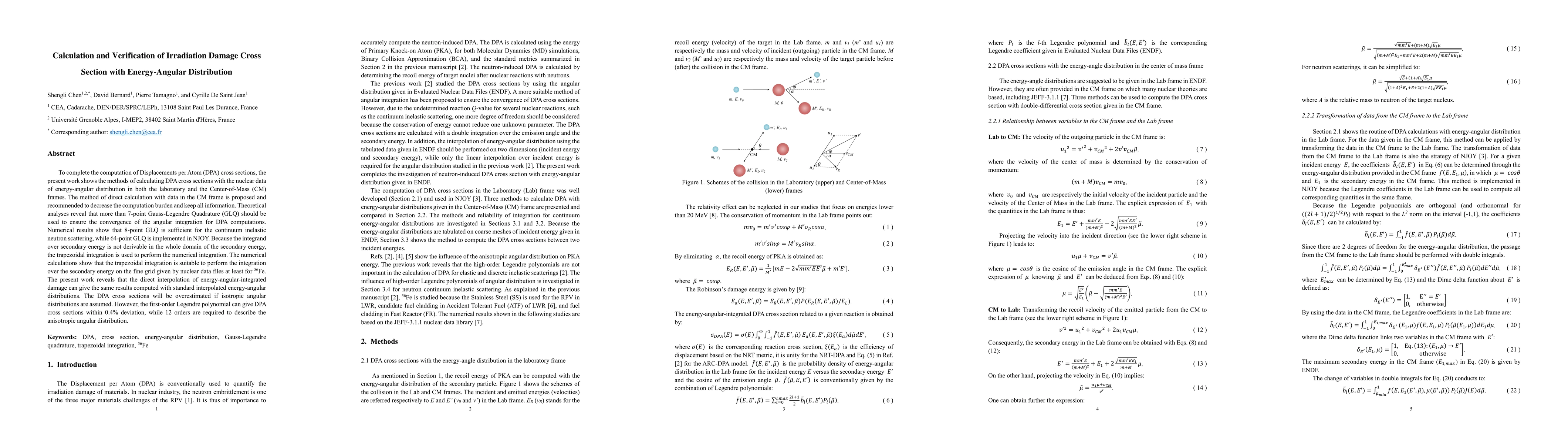 To complete the computation of Displacements per Atom (DPA) cross sections, the present work shows the methods of calculating DPA cross sections with the nuclear data of energy-angular distribution in both the laboratory and the Center-of-Mass (CM) frames. The method of direct calculation with data in the CM frame is proposed and recommended to decrease the computation burden and keep all information. Theoretical analyses reveal that more than 7-point Gauss-Legendre Quadrature (GLQ) should be used to ensure the convergence of the angular integration for DPA computations. Numerical results show that 8-point GLQ is sufficient for the continuum inelastic neutron scattering, while 64-point GLQ is implemented in NJOY. Because the integrand over secondary energy is not derivable in the whole domain of the secondary energy, the trapezoidal integration is used to perform the numerical integration. The numerical calculations show that the trapezoidal integration is suitable to perform the integration over the secondary energy on the fine grid given by nuclear data files at least for 56Fe. The present work reveals that the direct interpolation of energy-angular-integrated damage can give the same results computed with standard interpolated energy-angular distributions. The DPA cross sections will be overestimated if isotropic angular distributions are assumed. However, the first-order Legendre polynomial can give DPA cross sections within 0.4% deviation, while 12 orders are required to describe the anisotropic angular distribution.