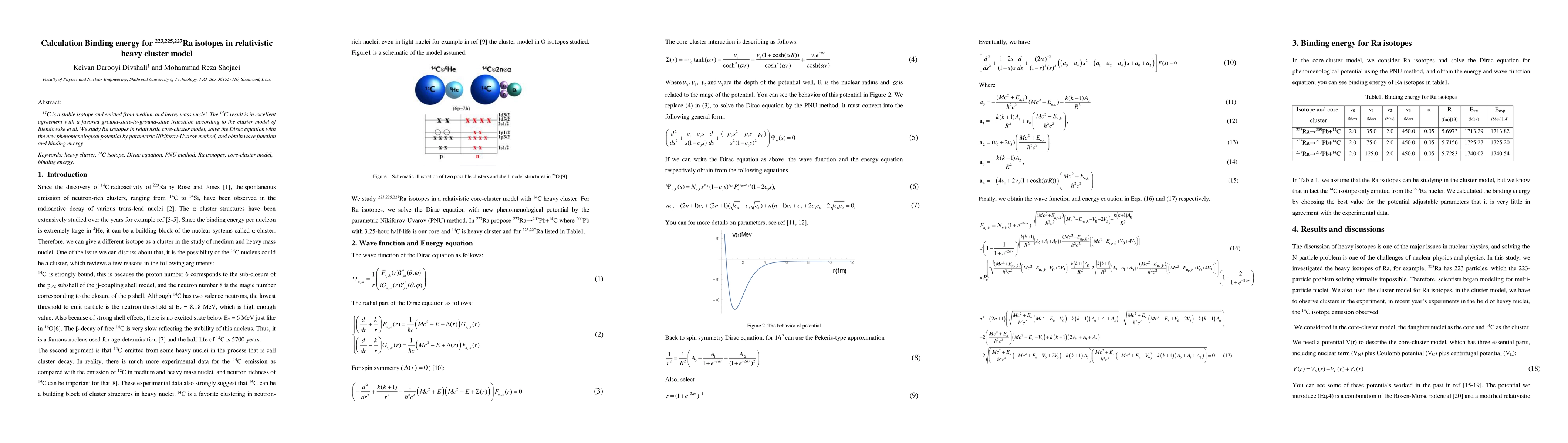 The research used a relativistic core-cluster model to study Ra isotopes, solving the Dirac equation with a new phenomenological potential using the parametric Nikiforov-Uvarov method.