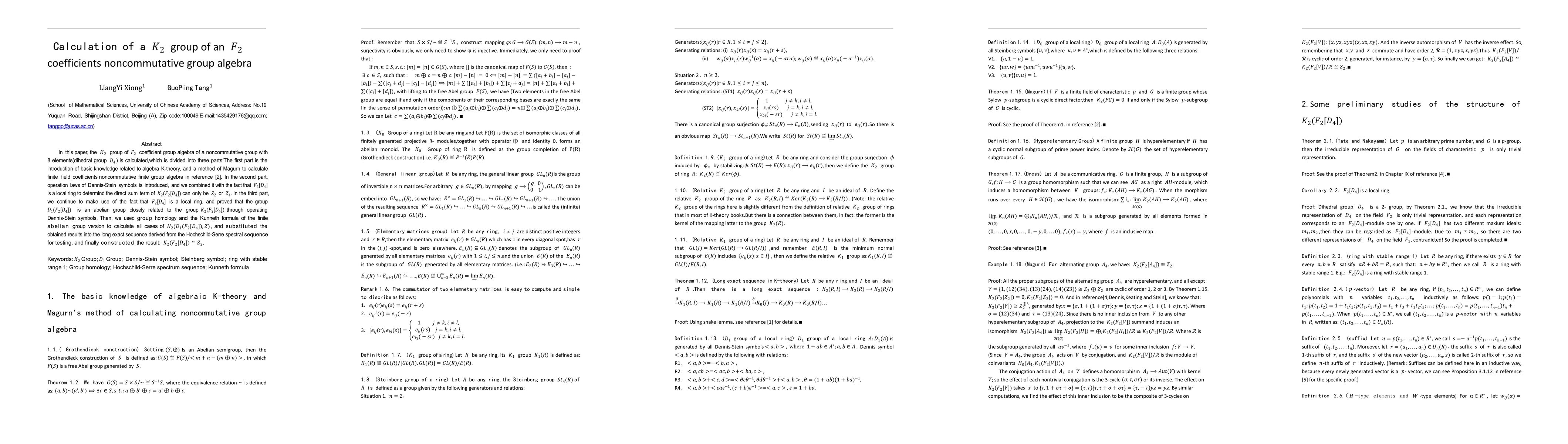 In this paper, the K_2 group of F_2 coefficients group algebra of a noncommutative group with 8 elements(dihedral group D_4 ) is calculated,which is divided into three parts:The first part is the introduction of basic knowledge related to algebra K-theory, and a method of Magurn to calculate finite field coefficients noncommutative finite group algebra in reference [2]. In the second part, operation laws of Dennis-Stein symbols is introduced, and we combined it with the fact that F_2[D_4] is a local ring to determind the direct sum term of K_2(F_2[D_4]) can only be Z_2 or Z_4. In the third part, we continue to make use of the fact that F_2[D_4] is a local ring, and proved that the group D_1(F_2[D_4]) is an abelian group closely related to the group K_2(F_2[D_4]) through operating Dennis-Stein symbols. Then, we used group homology and the Kunneth formula of the finite abelian group version to calculate all cases of H_2(D_1(F_2[D_4]),Z) , and substituted the obtained results into the long exact sequence derived from the Hochschild-Serre spectral sequence for testing, and finally constructed the result: K_2(F_2[D_4])=Z_2..