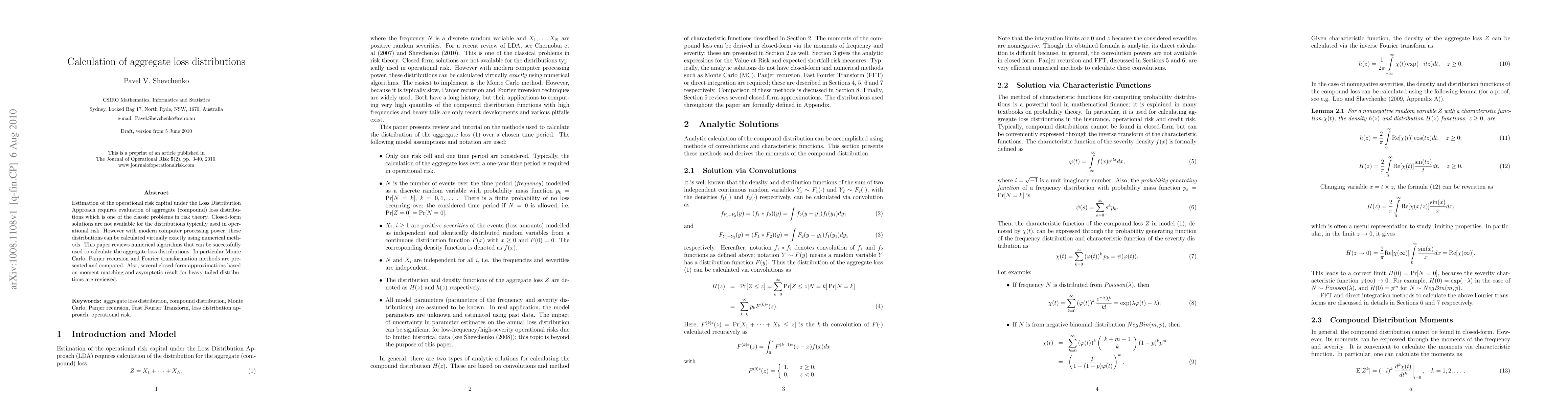 Estimation of the operational risk capital under the Loss Distribution Approach requires evaluation of aggregate (compound) loss distributions which is one of the classic problems in risk theory. Closed-form solutions are not available for the distributions typically used in operational risk. However with modern computer processing power, these distributions can be calculated virtually exactly using numerical methods. This paper reviews numerical algorithms that can be successfully used to calculate the aggregate loss distributions. In particular Monte Carlo, Panjer recursion and Fourier transformation methods are presented and compared. Also, several closed-form approximations based on moment matching and asymptotic result for heavy-tailed distributions are reviewed.