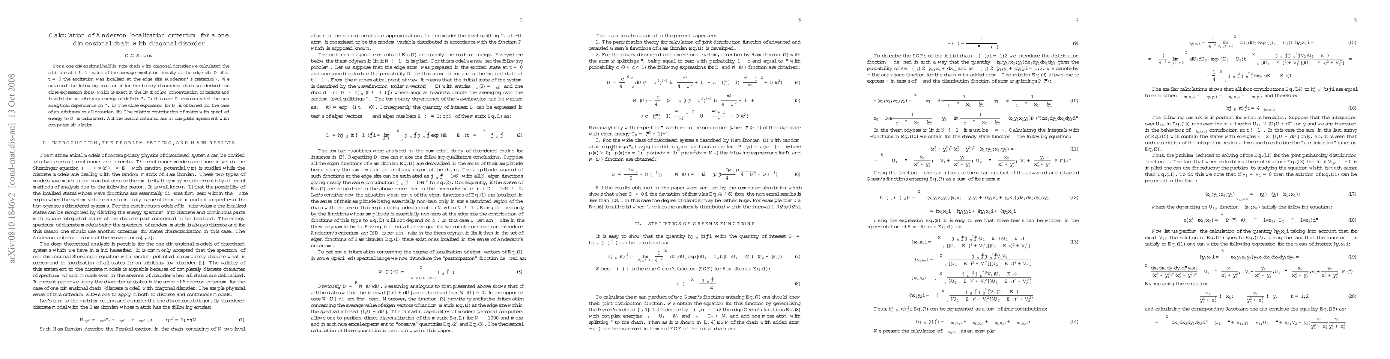 This paper calculates Anderson localization criterion for a one-dimensional chain with diagonal disorder, deriving expressions for the average excitation density at the edge site $D$ under binary disorder and small disorder conditions. Results show non-analytical dependence on defect energy and align with computer simulations.