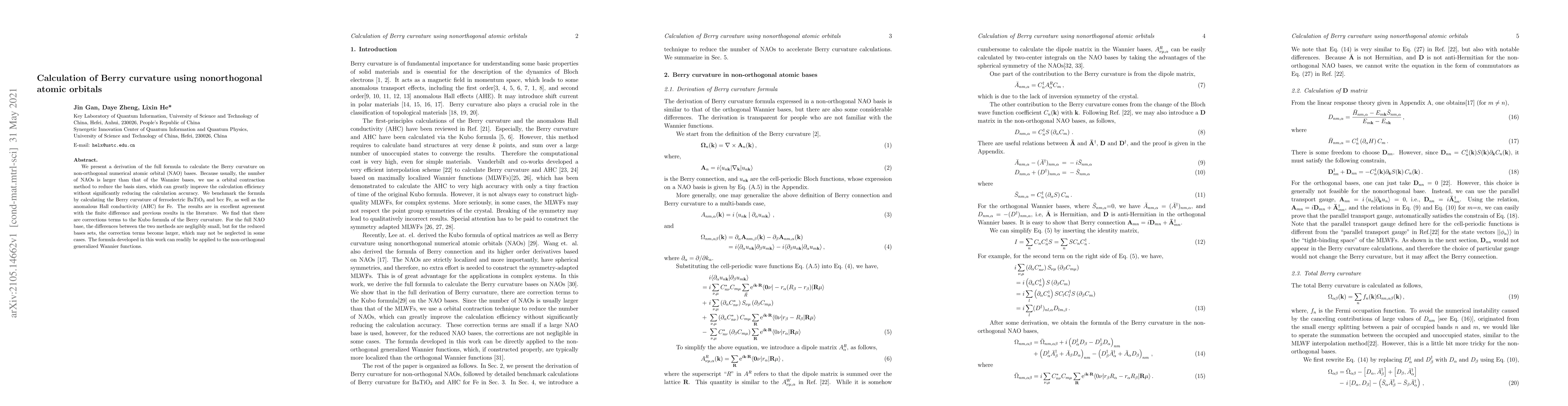 This paper derives a formula for calculating Berry curvature using non-orthogonal atomic orbitals, employing an orbital contraction method to enhance efficiency. Benchmarking on BaTiO$_3$ and Fe shows agreement with previous results, highlighting the importance of correction terms in the Kubo formula for reduced basis sets.