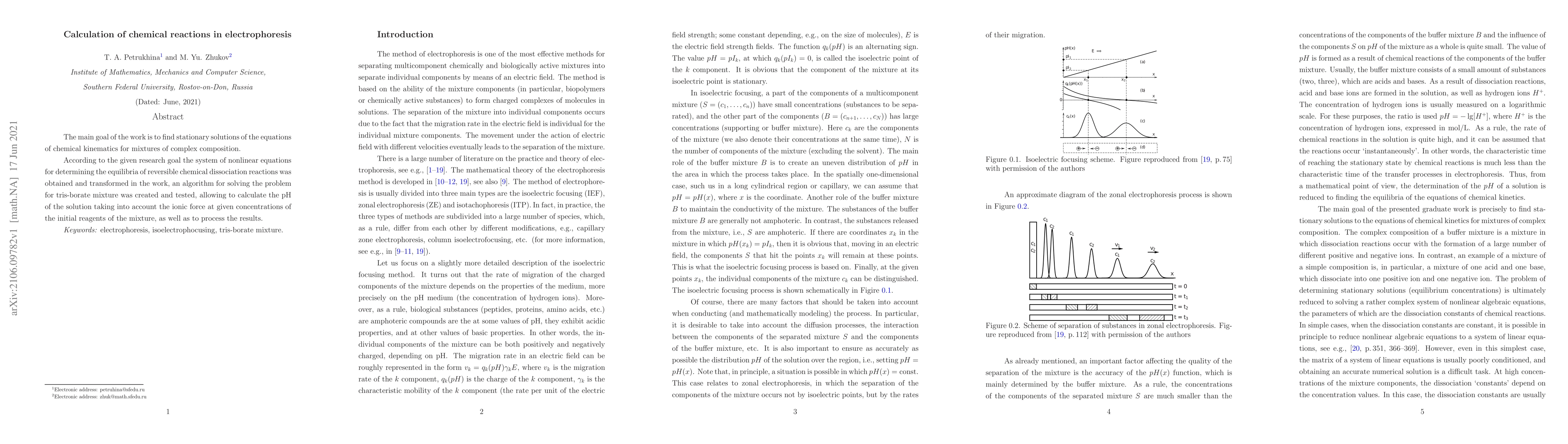 The main goal of the work is to find stationary solutions of the equations of chemical kinematics for mixtures of complex composition. According to the given research goal the system of nonlinear equations for determining the equilibria of reversible chemical dissociation reactions was obtained and transformed in the work, an algorithm for solving the problem for tris-borate mixture was created and tested, allowing to calculate the pH of the solution taking into account the ionic force at given concentrations of the initial reagents of the mixture, as well as to process the results.