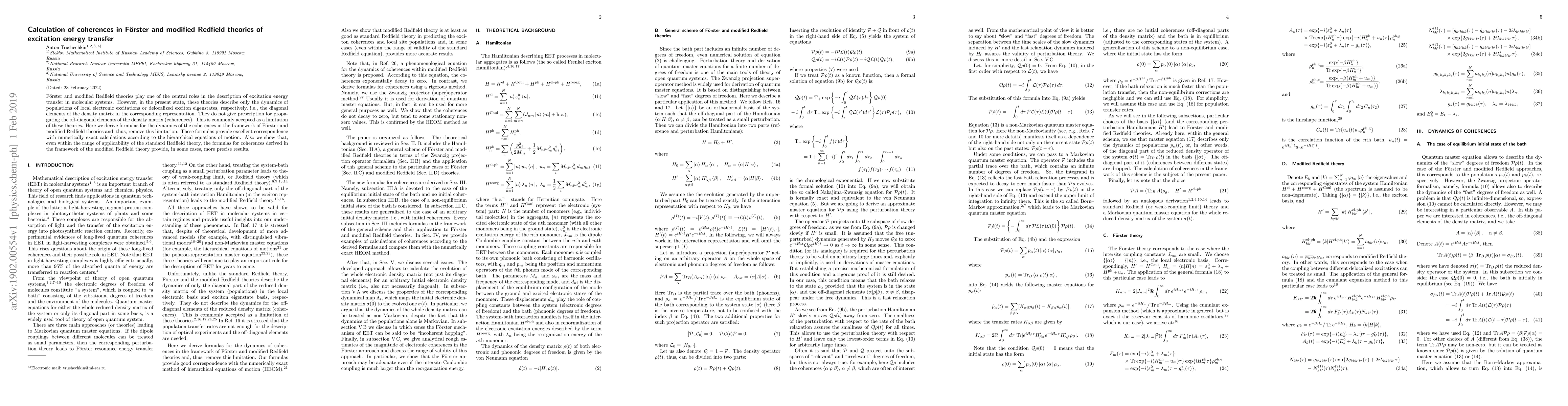 This paper derives formulas for the dynamics of coherences in Foerster and modified Redfield theories, addressing a limitation in these theories that previously only described population dynamics. The new formulas show excellent agreement with numerically exact calculations and provide more precise results in some cases.