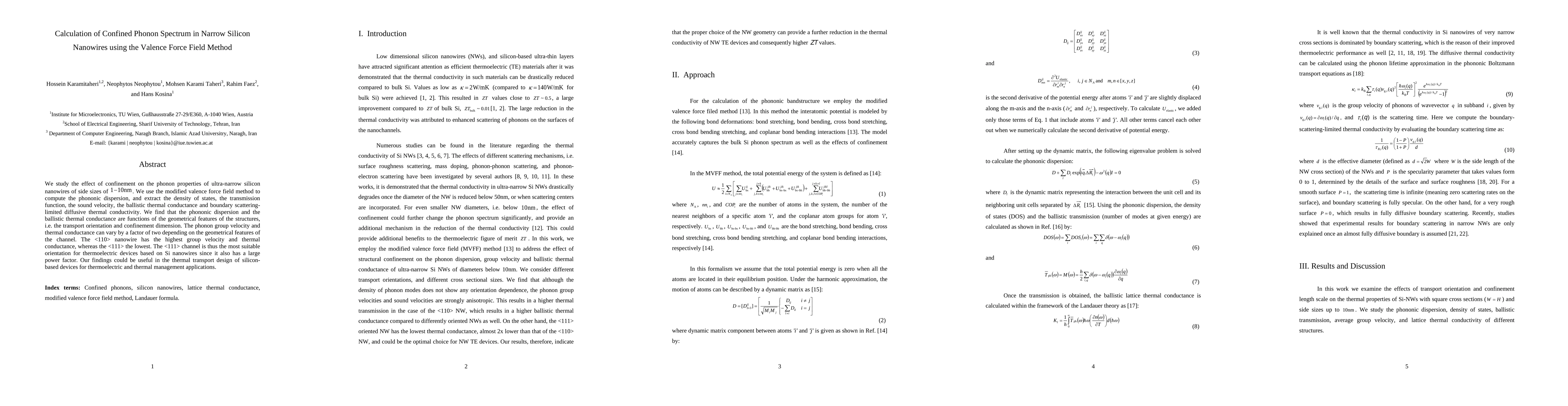 This paper investigates the phonon properties in ultra-narrow silicon nanowires using the valence force field method, finding significant variations in phonon dispersion and thermal conductance based on nanowire geometry and orientation. The <111> orientation is identified as optimal for thermoelectric devices due to its lower thermal conductivity and higher power factor.