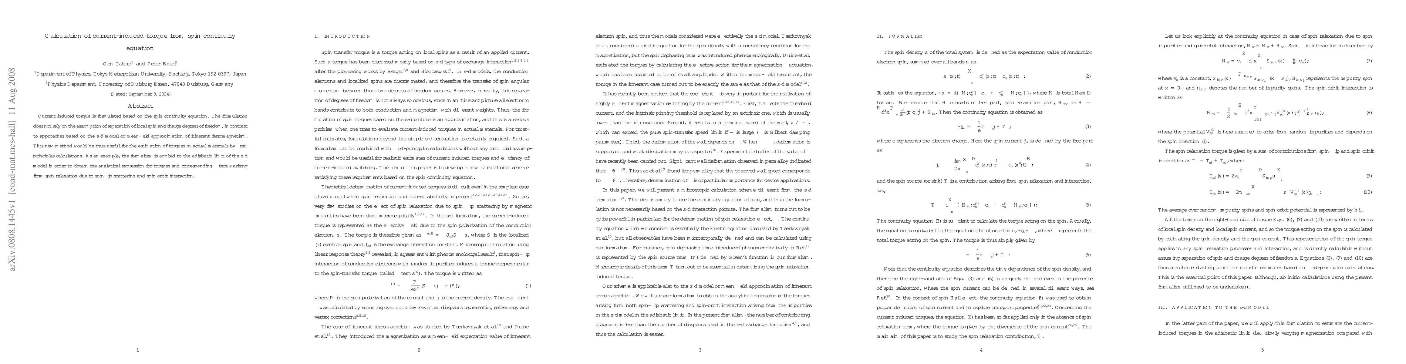 This paper presents a novel method for calculating current-induced torque based on the spin continuity equation, avoiding assumptions of separated local spin and charge degrees of freedom. The approach is demonstrated through the adiabatic limit of the $s$-$d$ model, yielding analytical expressions for torques and $\beta$ terms.