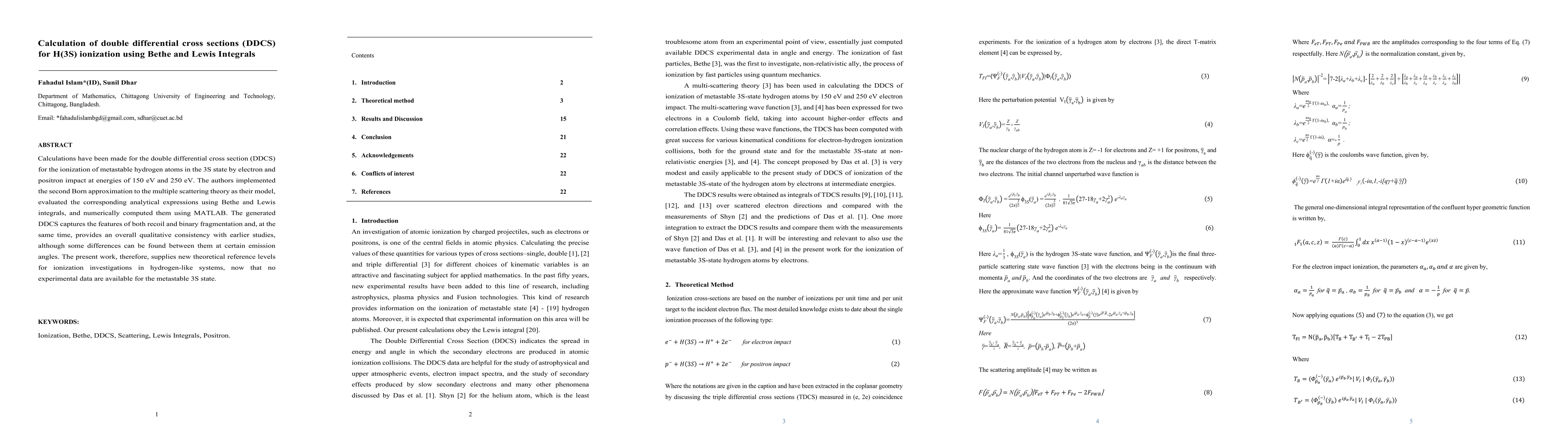 The work presents a detailed analytical framework using Bethe and Lewis integrals within the second Born approximation to compute DDCS for metastable hydrogen ionization.