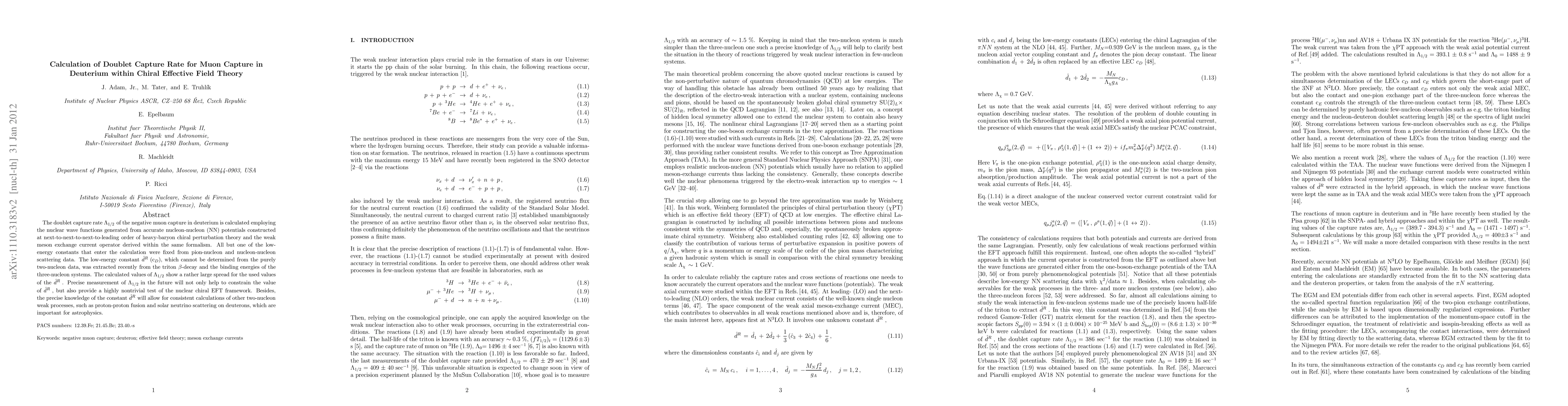 The doublet capture rate of the negative muon capture in deuterium is calculated employing the nuclear wave functions generated from accurate nucleon-nucleon potentials constructed at next-to-next-to-next-to-leading order of heavy-baryon chiral perturbation theory and the weak meson exchange current operator derived within the same formalism. All but one of the low-energy constants that enter the calculation were fixed from pion-nucleon and nucleon-nucleon scattering data. The low-energy constant d^R (c_D), which cannot be determined from the purely two-nucleon data, was extracted recently from the triton beta-decay and the binding energies of the three-nucleon systems. The calculated values of the doublet capture rates show a rather large spread for the used values of the d^R. Precise measurement of the doublet capture rate in the future will not only help to constrain the value of d^R, but also provide a highly nontrivial test of the nuclear chiral EFT framework. Besides, the precise knowledge of the constant d^R will allow for consistent calculations of other two-nucleon weak processes, such as proton-proton fusion and solar neutrino scattering on deuterons, which are important for astrophysics.